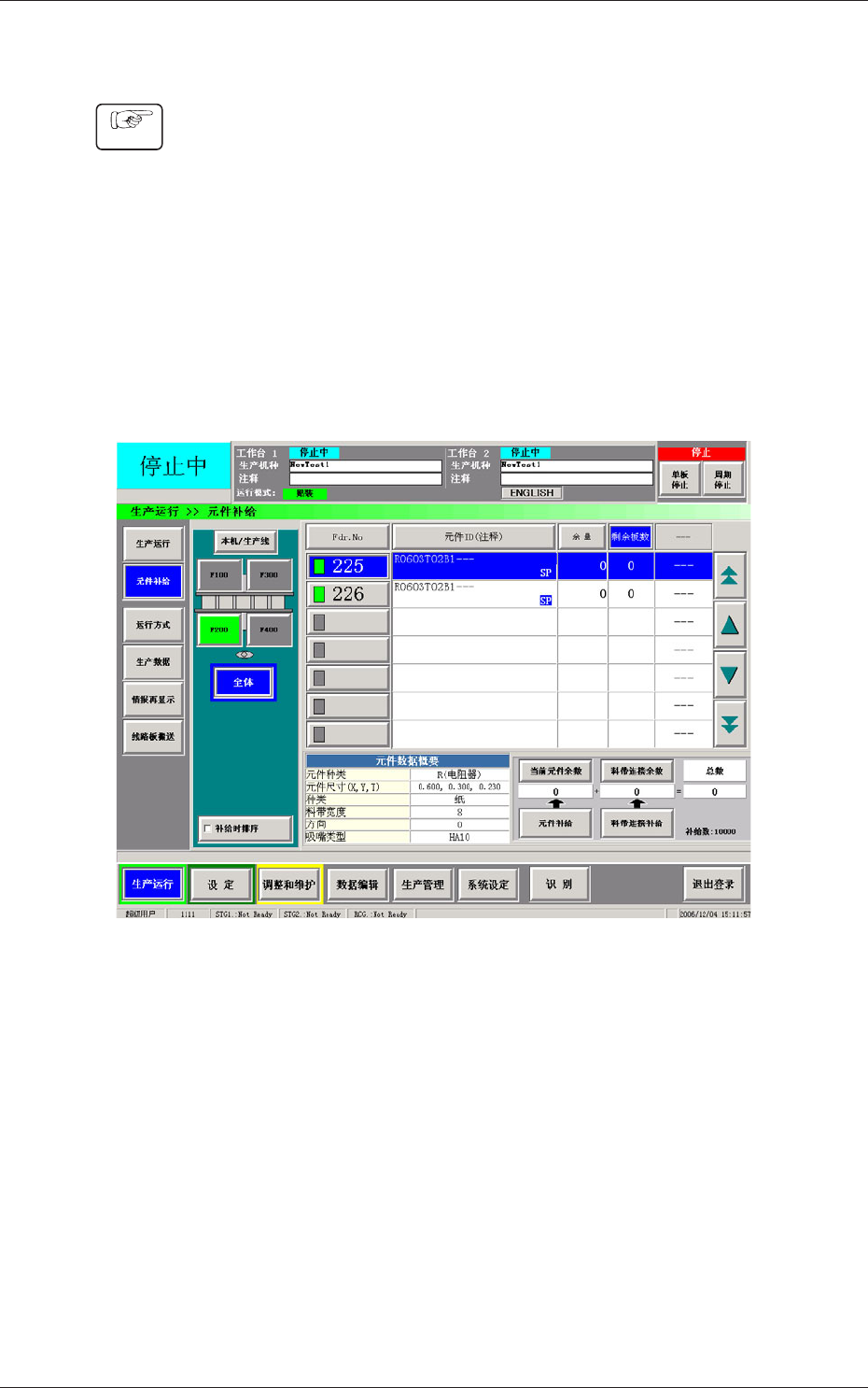 (5) 按生产运行主要界面的 [ 元件补给 ] 按钮,切换到“元件补给”