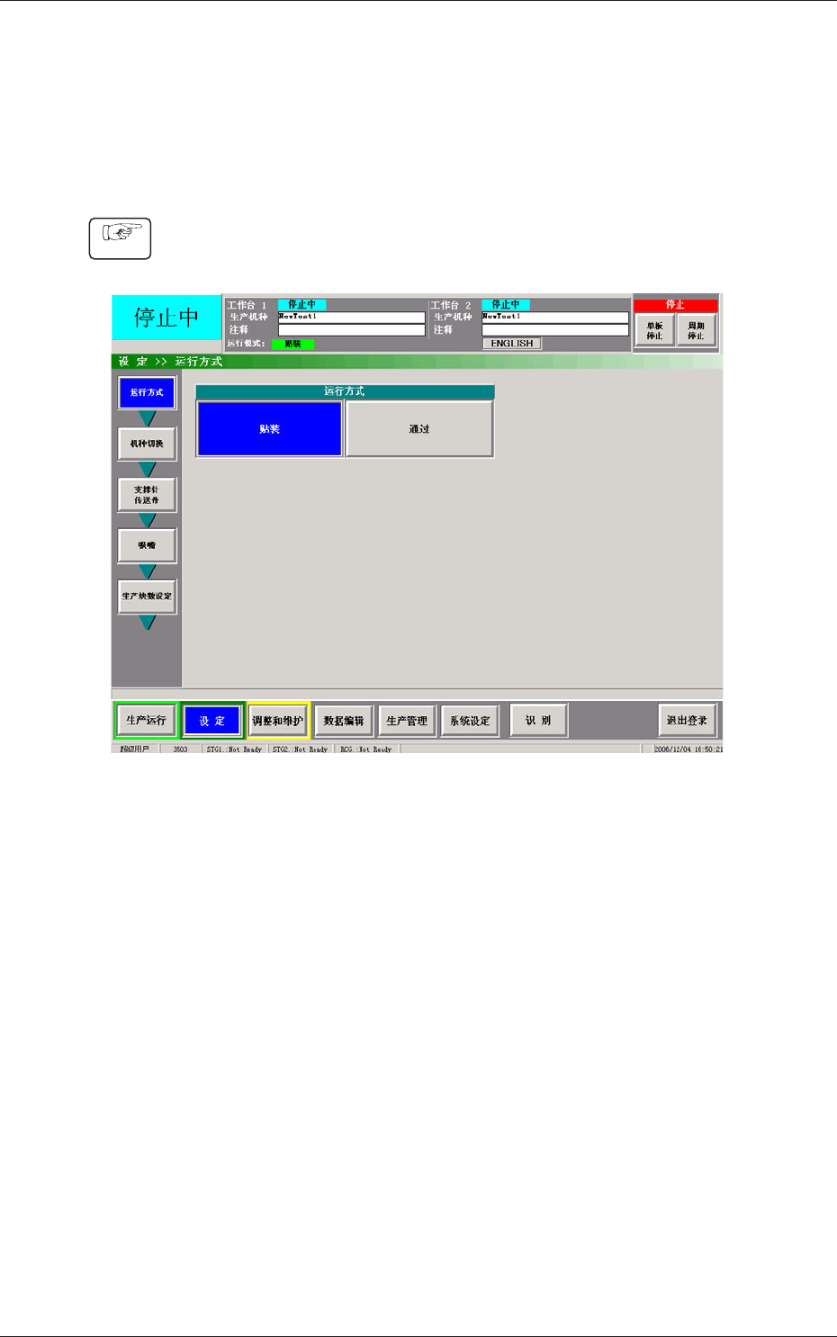 3 - 5 3. 生产机种的切换 3.1 运行方式的选择 在设定 菜单的 “运行方 式”界面 中选择运 行方式 。 Procedure (1) 按 “设定” 菜单的 [ 运行方式 ] 按钮, 显示 “运行方式” 界面。 Fig.1C3 (2) 在“运行方式”界面选择运行方式。 通常选择 [ 贴装 ]。 3. 生产机种的切换 0708 - 001