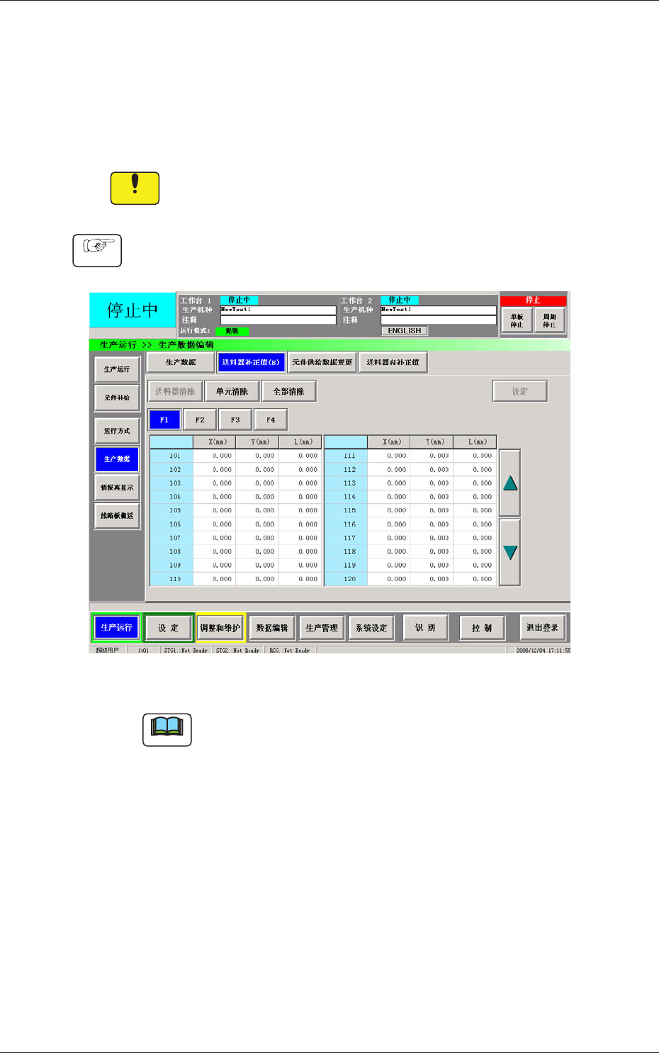 (1) 在 [ 生产运行 ] 菜单的“生产数据”界面中,按 [ 全部清除 ]