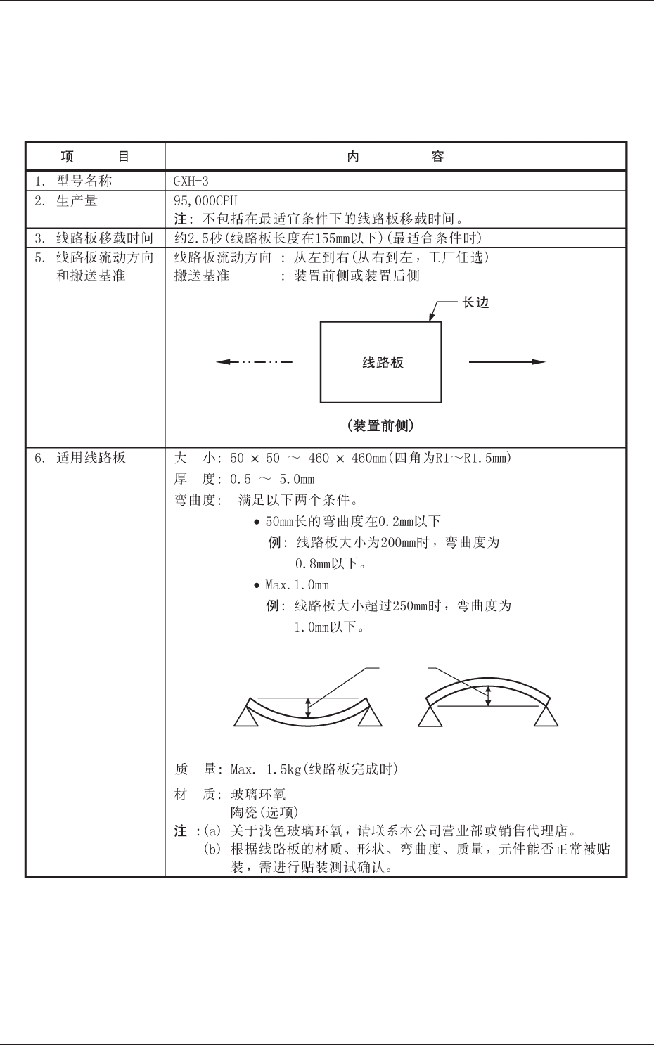 4 - 1 1. 规 格 1.1 GXH-3 贴片机规格 Table 1D1-1 弯曲度 1. 规 格 0807 - 002