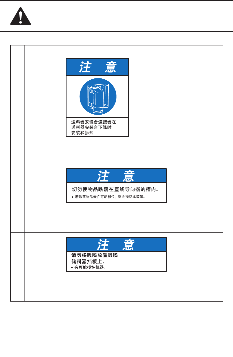 安全 - 31 No. 警告标签及其说明 (27) 说 明 运送装置时,请从装置正面或装置背面插入叉子或叉板。 从装置侧面插入,有可能破损电器设备部。 (28) 说 明 请勿在送料器安装台上横放送料器或工具等。 否则会成为装置故障的原因。 (29) 说 明 在装置内部进行作业时,若将手或物品放置在支撑台使其受重压时,就有可 能变形。 (30) 说 明 若 没有正常安装过滤器支架,就有可能发生吸取错误或过滤器掉下来与安装 …