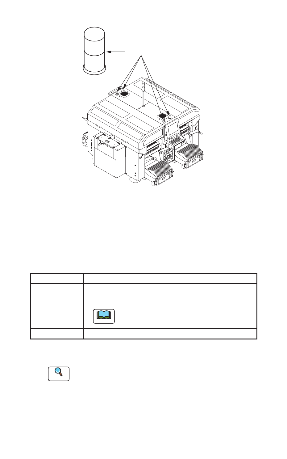 1 - 20 2.3.2 塔灯 Fig.1A10 塔灯 塔灯通过指示灯和警告音告知装置状态。 • 指示灯的亮灯颜色 装置出厂时的设定如下 : Table 1A3 亮灯颜色 装 置 状 态 红色 异常发生 ( 运行停止 ) 黄色 元件断料 ( 预告 ) 绿色 生产运行 待机中时闪烁。 注意 请注意塔灯为绿色灯亮中或闪烁中时,即使装置不运转,也 处于自动运行中 ( 待机状态 )。 • 警告音 Table 1A4 警告音 装 置 状 态 连续…