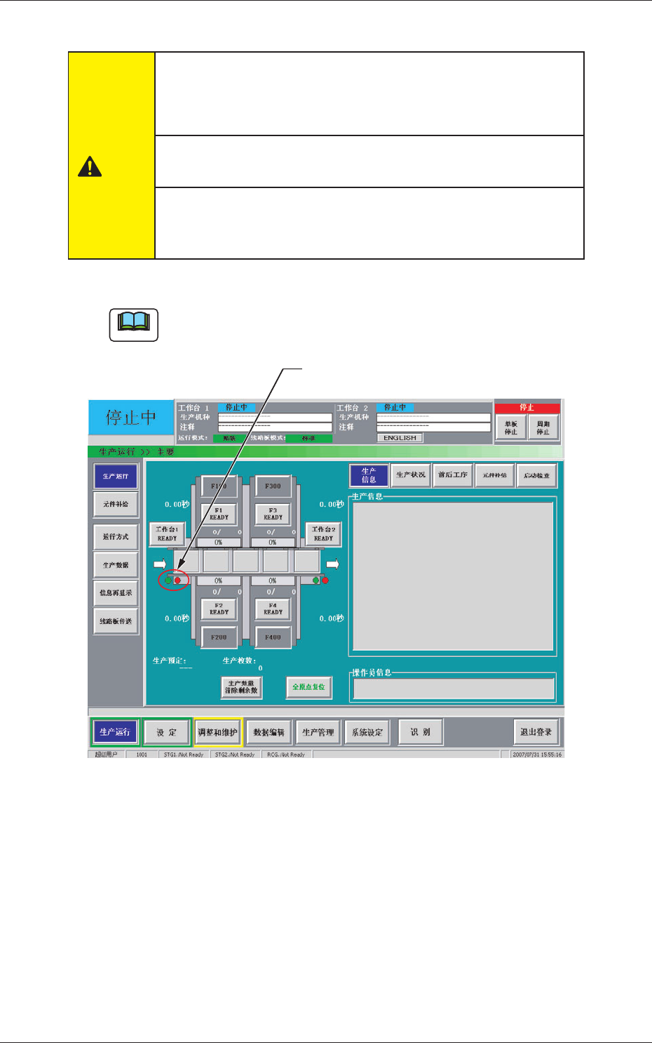 打开机盖时,“生产运行”界面的供给传送带部分亮红灯,显