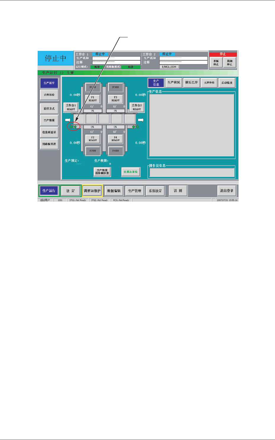 关闭机盖时,“生产运行”界面的供给传送带部分亮绿灯,显示“机盖 / 关”