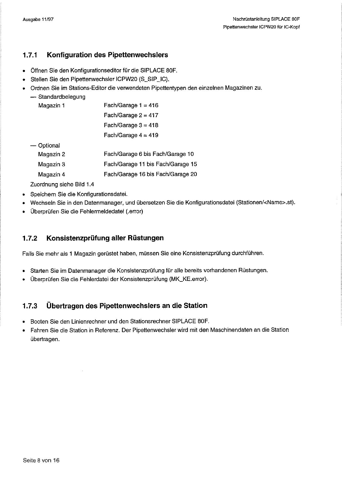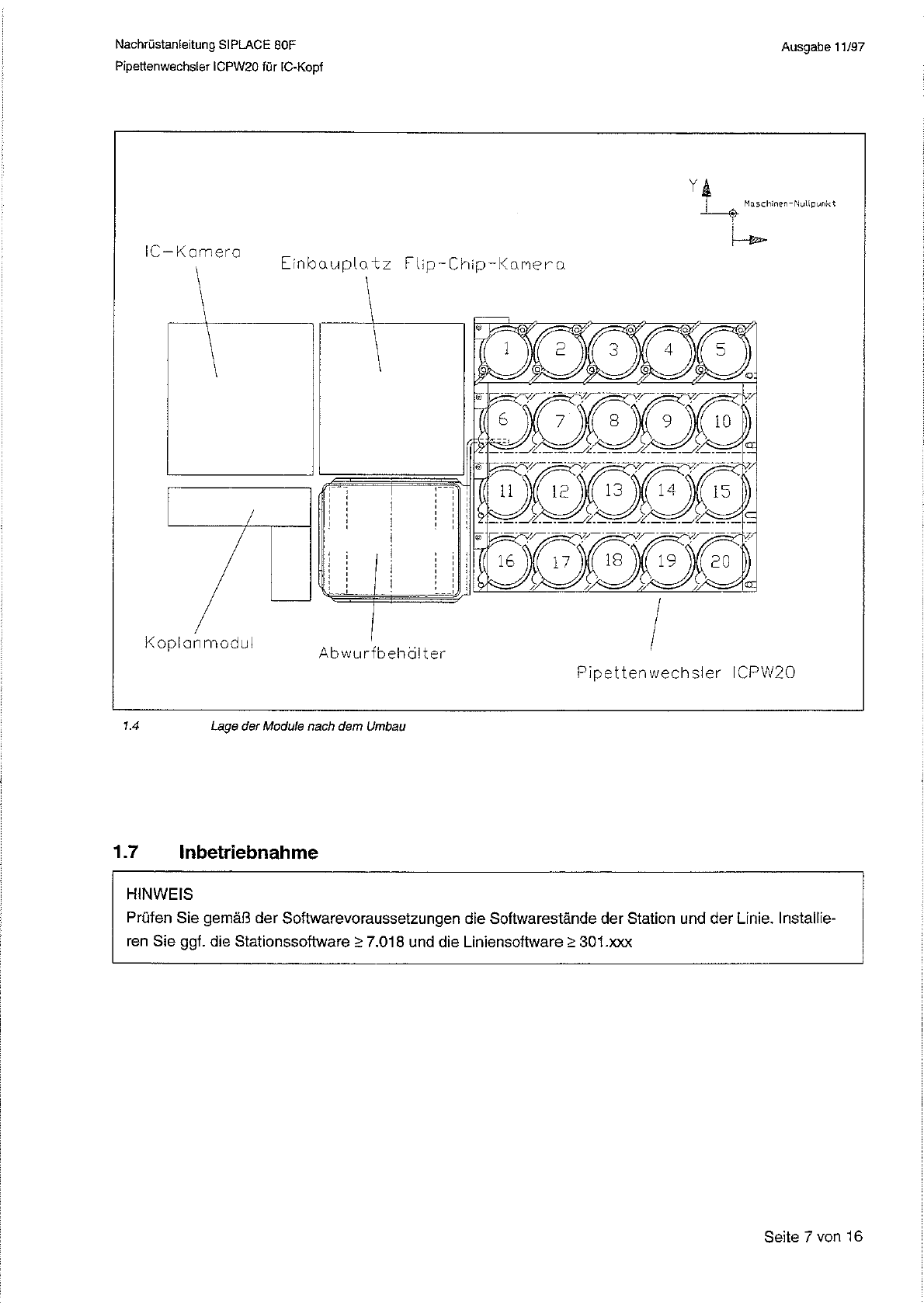 Nachrustanleitung SI PLACE 80 F Pipettenwechsler ICPW 20 fur IC - Kopf Ausgabe 11 / 97 Lage der Module nach dem Umbau 1.4 1.7 Inbetriebnahme HINWEIS PrOfen Sie gemaB der Softwarevoraussetzungen die Softwarestande der Sta…