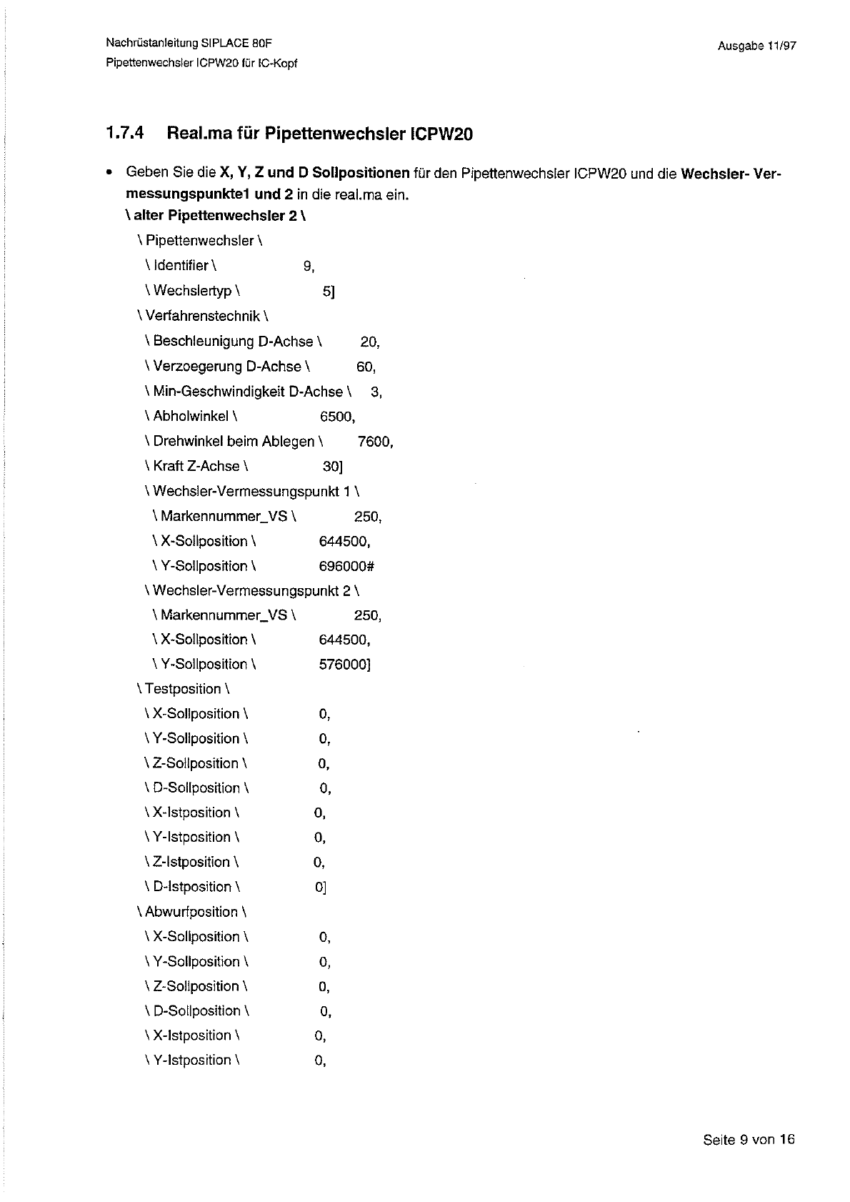 Ausgabe 11 / 97 Nachrustanleitung SIPLACE 80 F Pipettenwechsler ICPW 20 fur IC - Kopf 1.7 . 1 Konfiguration des Pipettenwechslers • Offnen Sie den Konfigurationseditor fur die SIPLACE 80 F . • Stellen Sie den Pipettenwec…