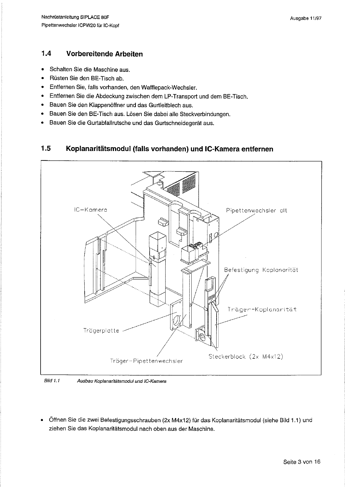 Nachrustanieitung SIPLACE 80 F Pipettenwechsler ICPW 20 fur IC - Kopf Ausgabe 11 / 97 1.4 Vorbereitende Arbeiten • Schalten Sie die Maschine aus . • Rusten Sie den BE - Tisch ab . • Entfernen Sie , falls vorhanden , den …