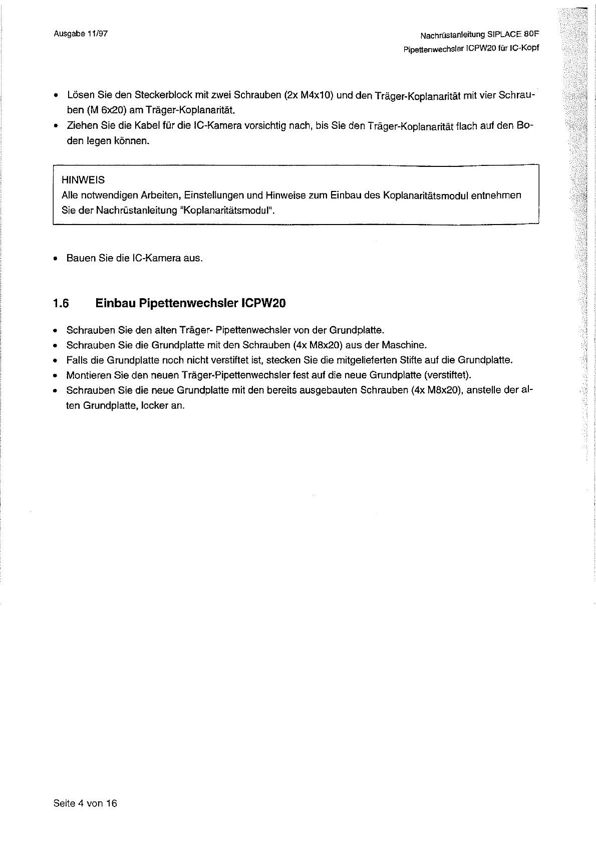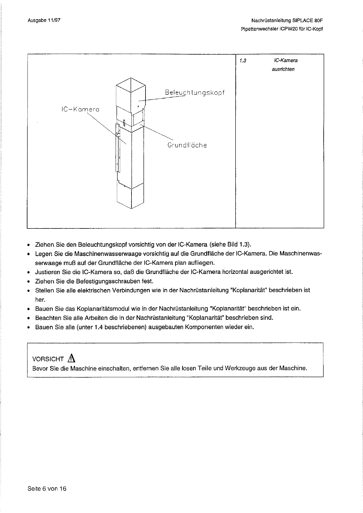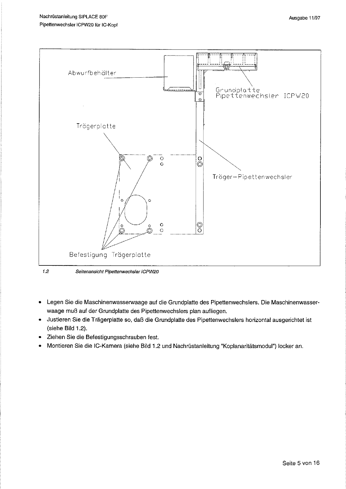 Nachrustanleitung SIPLACE 80 F Pipettenwechsler ICPW 20 fur IC - Kopf Ausgabe 11 / 97 Abwurfbehalter — G r u n d p Pipetf ( l a t t e e n w e c h s l e r I C P W 2 0 © Trdgerplatte o ◎ Trdger - Pipettenwechsler ◎ o Befes…