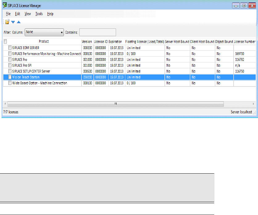 Abb. 7.4 - 6 Lizenzeintrag im SIPLACE License Manager für die SIPLACE Vision Teach Station