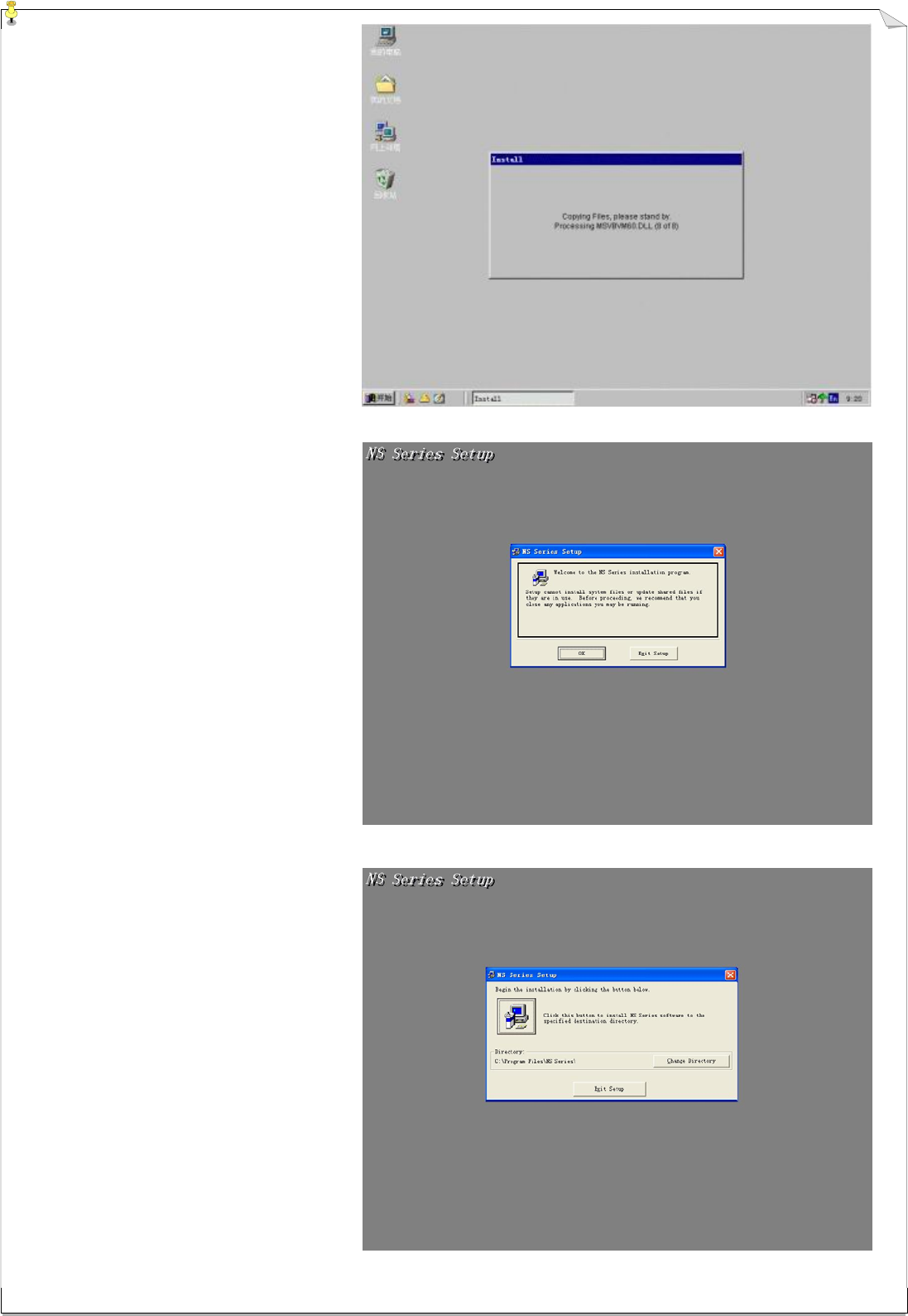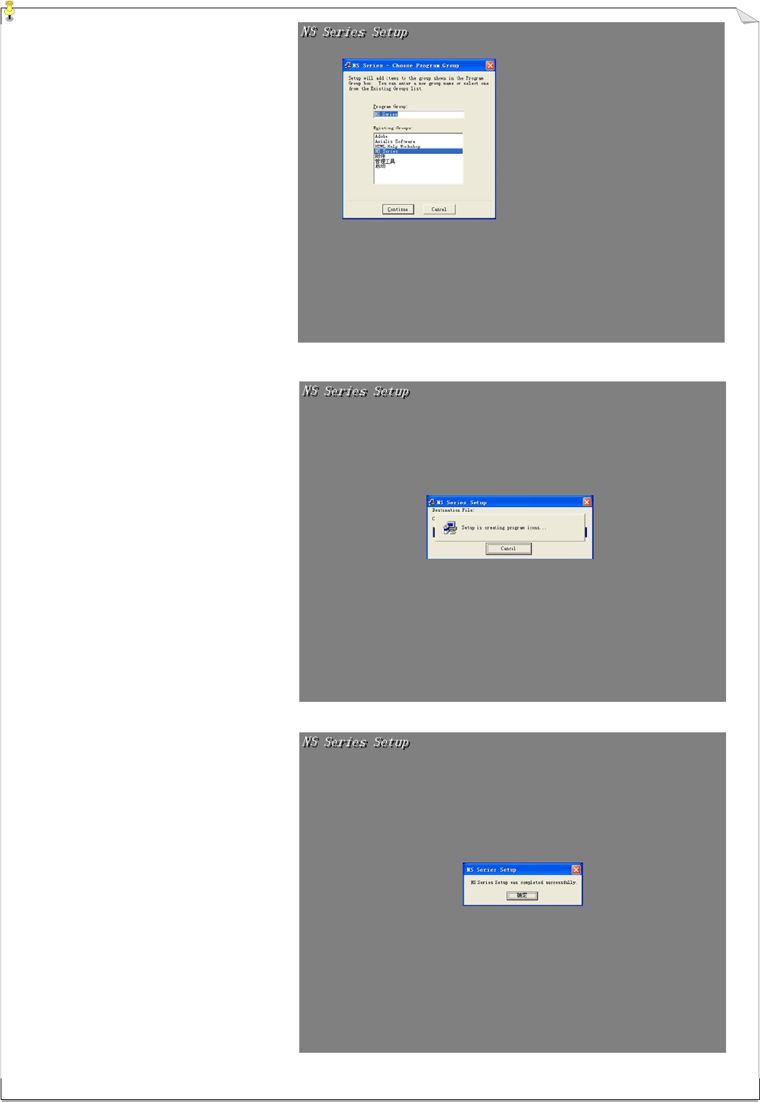 劲拓电子设备有限公司 第 10 页 共 66 页 NS 系列无铅回流焊机用户手册 (A1.0) 系统将显示如右图画面,要求用户 选择软件安装的程序组,系统默认的 是 “ NS Series ” ,按 “ Continue ” 将进行下一步安装,。 系统显示如右图系统复制文件进 度的安装接口。 拷贝完文件后将会更新系统,最后出 现如右图安装完毕的画面