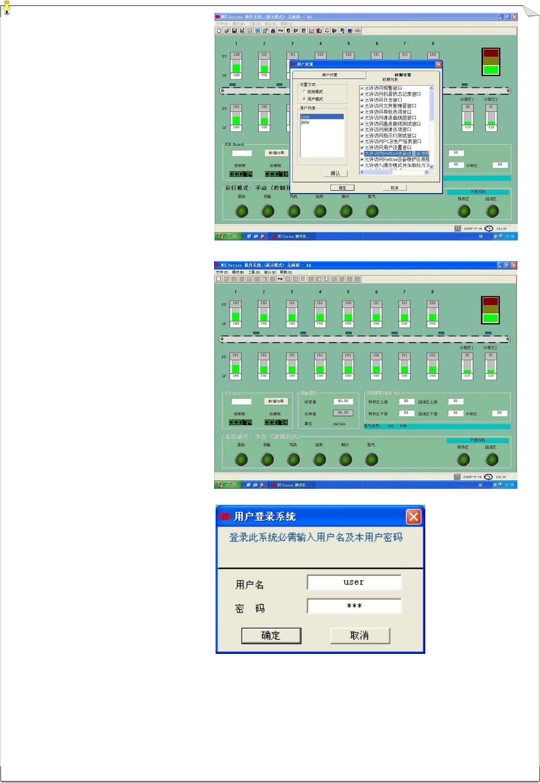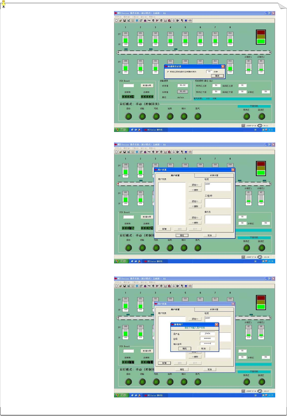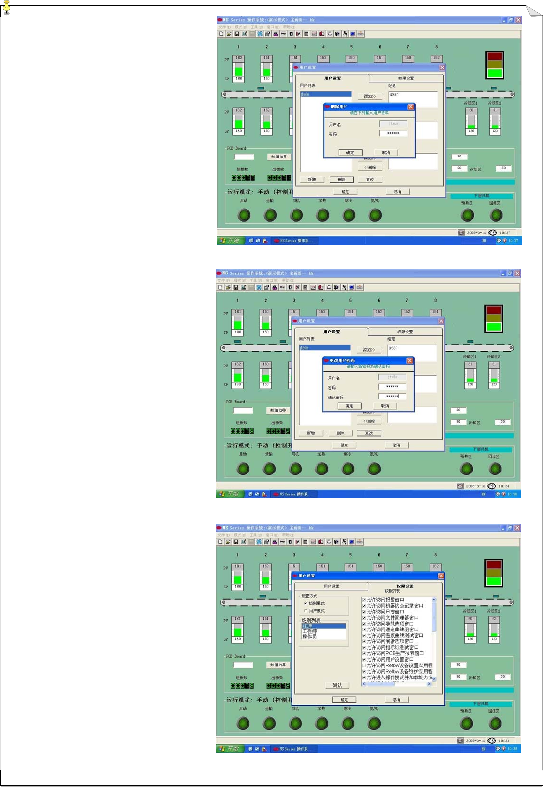 劲拓电子设备有限公司 第 25 页 共 66 页 NS 系列无铅回流焊机用户手册 (A1.0) 2. 选择“ 删除 ”选项时如右图所示, 用户输入所需待删除的用户对应的密 码。按 “确定” 键便将此用户删除了, 注意 :请慎用此选项。 3. 选择 “更改” 选项时,系统将会 弹出如右上图所示的对话框,要求用户 输入此用户原密码,输入完毕后按 “确 定” 键,系统将会显示如右图画面,用 户输入所要更改的密码及确认密码,按 “ 确定 ”键便…