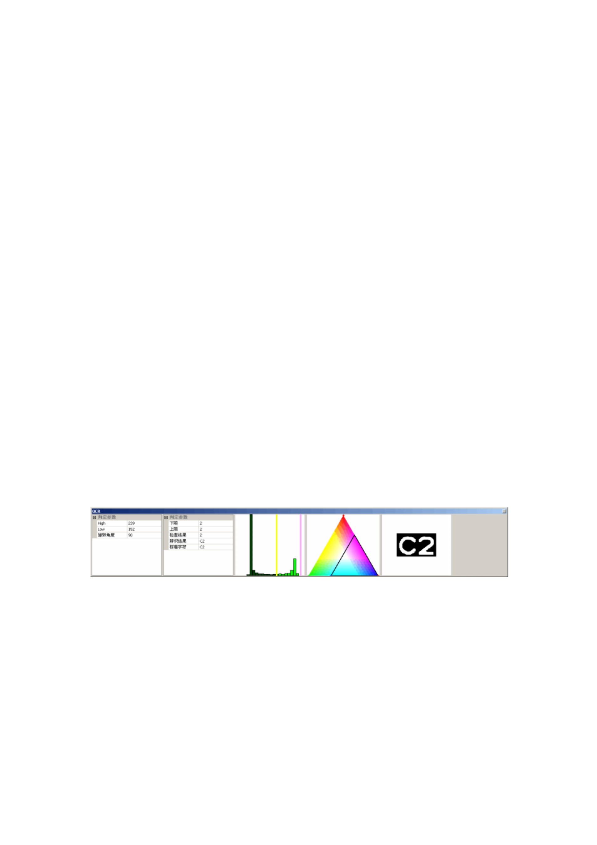 f) 绿色下限:设定绿色最小值( 0~173 ) g) 蓝色上限:设定蓝色最大值( 0~173 ) h) 蓝色下限:设定蓝色最小值( 0~173 ) 判定参数: a) 上限:检查窗口内文字个数的最多值 b) 下限:检查窗口内文字个数的最少值 c) 辨识结果:检查窗口内符合亮度和颜色 识别出的文字 d) 标准字符:参考文字 检查结果:结果符合上限和下限之间,判定结果为 OK 。 反之,判定结果为 NG 替代字符设定:字符 0(O),1(I…