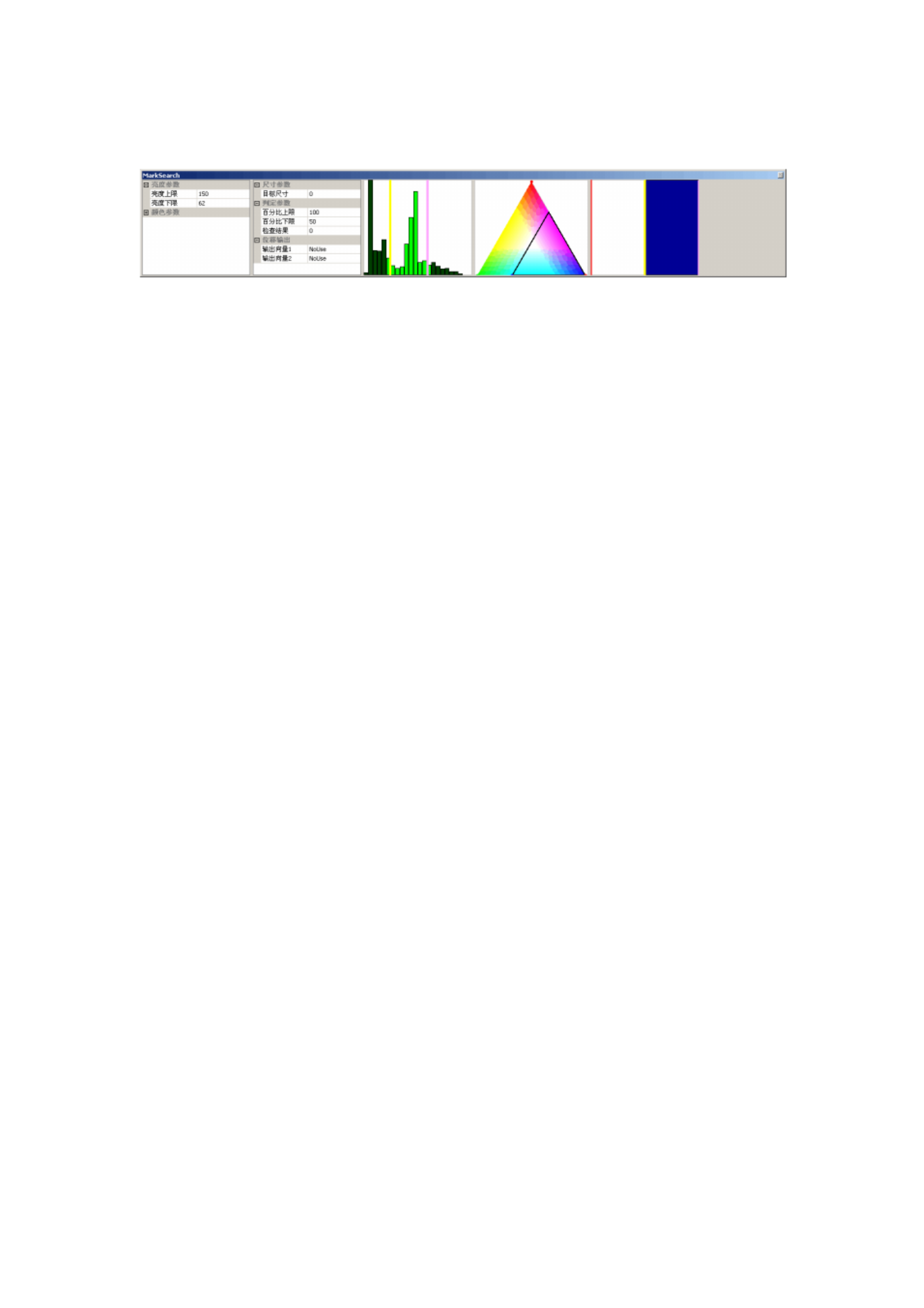 MarkSearch 计算参数: 亮度参数(可用鼠标通过直方图来设定): a) 亮度上限:设定最高亮度值( 0~255 ) b) 亮度下限:设定最低亮度值( 0~255 ) 颜色参数(可用鼠标通过色彩图来设定): c) 红色上限:设定红色最大值( 0~173 ) d) 红色下限:设定红色最小值( 0~173 ) e) 绿色上限:设定绿色最大值( 0~173 ) f) 绿色下限:设定绿色最小值( 0~173 ) g) 蓝色上限:设定蓝色最…