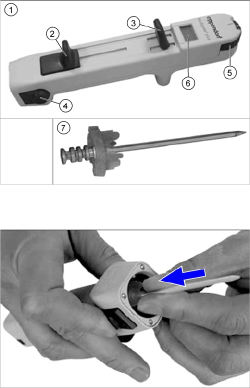 ► 同时按住两个拒绝按钮。Combitip 将从 Multipette 中释放出来。显示内容将被删除。
