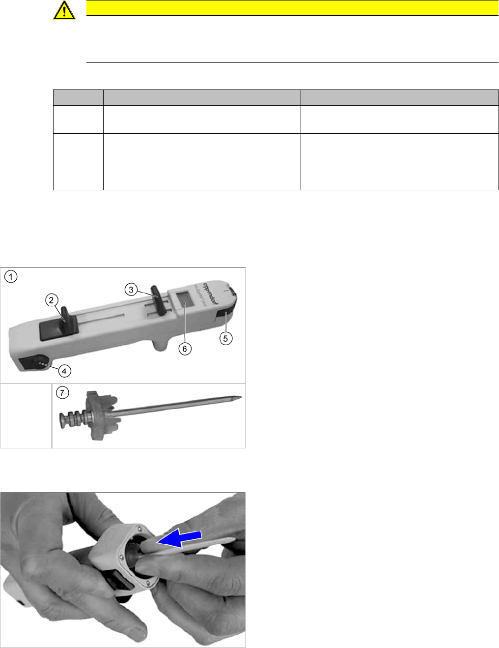 ► 使用容器 (含相关润滑剂)或废料仓保留 Combitip,并将填充杆向右下方推动。剩余的润滑剂将被