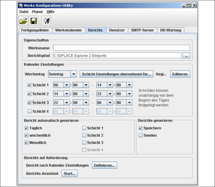 angeben, wie oft die Werks-Berichte generiert werden sollen, wo sie abgelegt werden sollen,