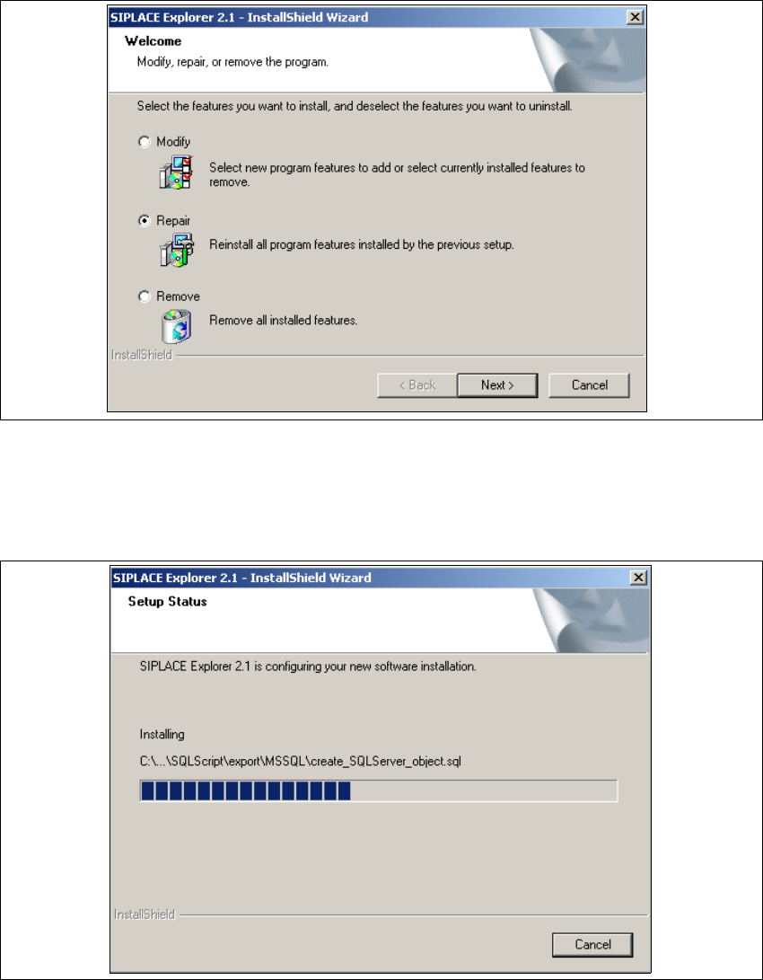 Installations- und Konfigurationsanleit ung SIPLACE Explorer 5 Deinstallation Ausgabe 11/2006 DE 5.3 Repair 125 5.3 Rep air 5 Abb. 5 - 6 SIPLACE Explorer 2.1 - Installshield-Assistent → Klicken Sie Repai r (Wiederherstel…