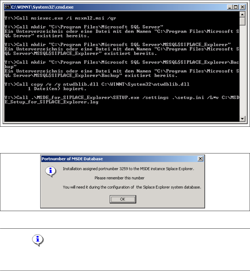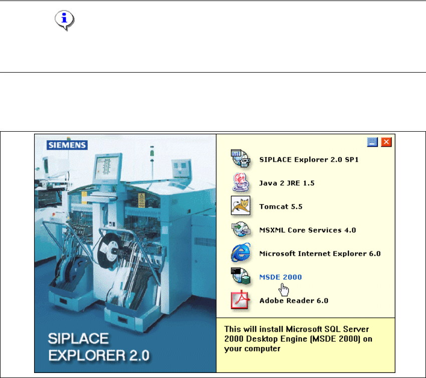 Installations- und Konfigurationsanleitung SIPLAC E Explorer 3 Installation des SIPLACE Explorer Ausgabe 11/2006 DE 3.1 Erstinstallation von SIPLACE Explorer 2.1 53 3.1.4 Inst allationsvorgang MSDE 2000 HINWEIS Sie müsse…