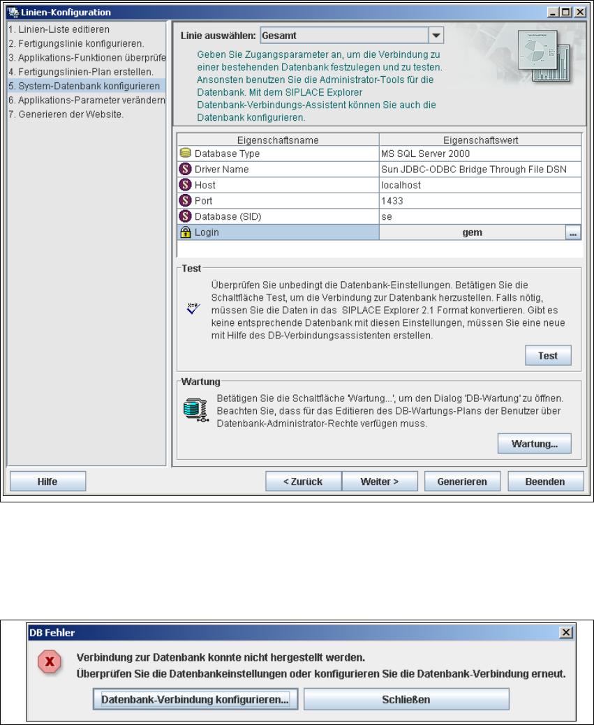 4 Konfiguration Installations- und Konf igurationsanleitung SIPLACE Explorer 4.1 Standard Monitoring Application (Überwachungsanwendun g) Ausgabe 11/2006 DE 84 4 Abb. 4 - 9 Schritt 5: System-Datenbank konfigurieren → Prü…