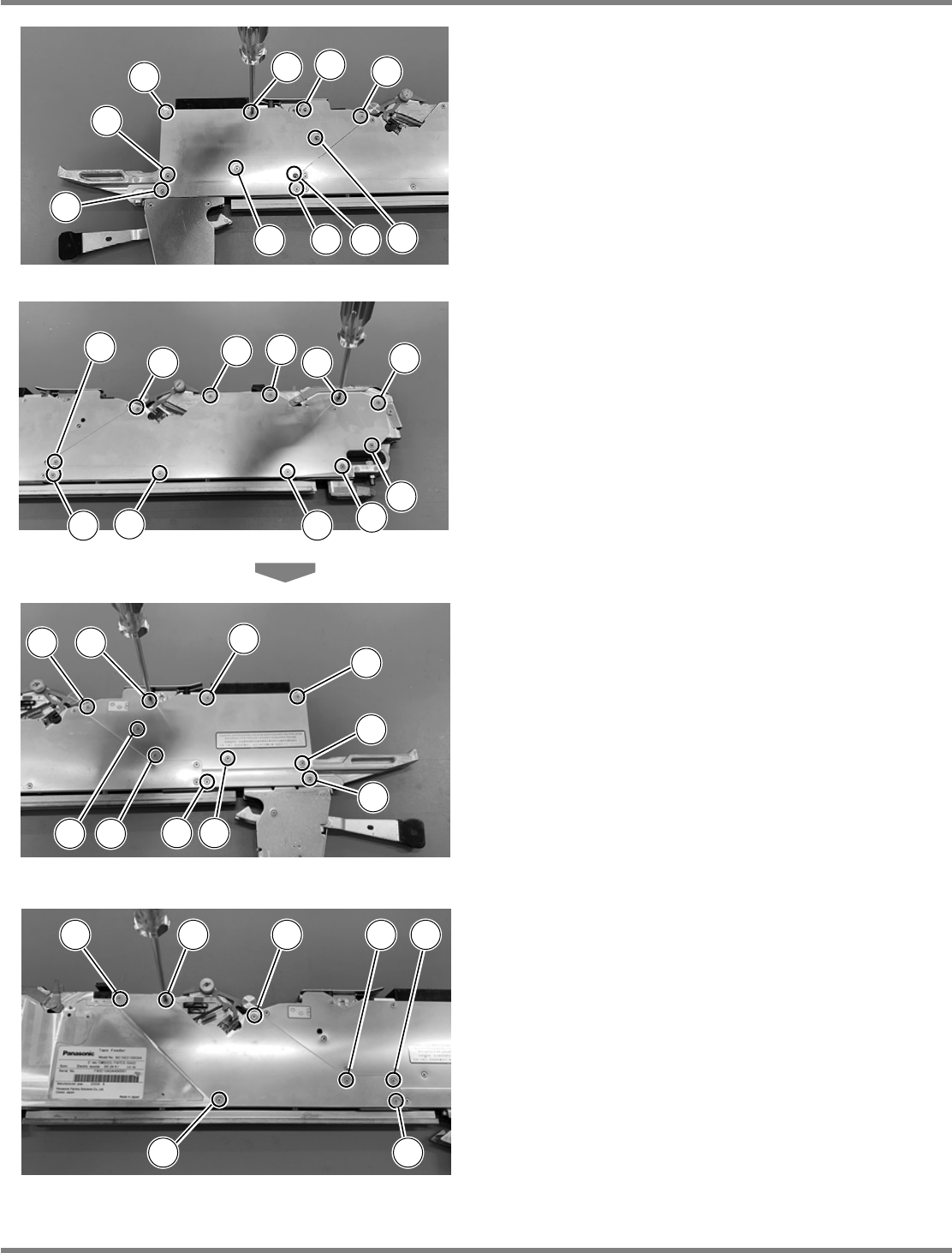 Intelligent Tape Feeder 操作手册 6.2 8 mm ~ 104 mm 编带供料器的驱动齿轮部的 清扫 INTF-C-OME06-A01-11 Page 6-15 【是 12 mm/16 mm, 24 mm/32 mm , 44 mm/56 mm, 72 mm 的编带供料器时】 要求 要除去卡入的芯片而拆下了盖时,作业时请注意不要使异物混入及 注意不要碰断电线。 1 拧松螺丝取下盖。 ∗ 螺丝刀要使用 #1 。 2…