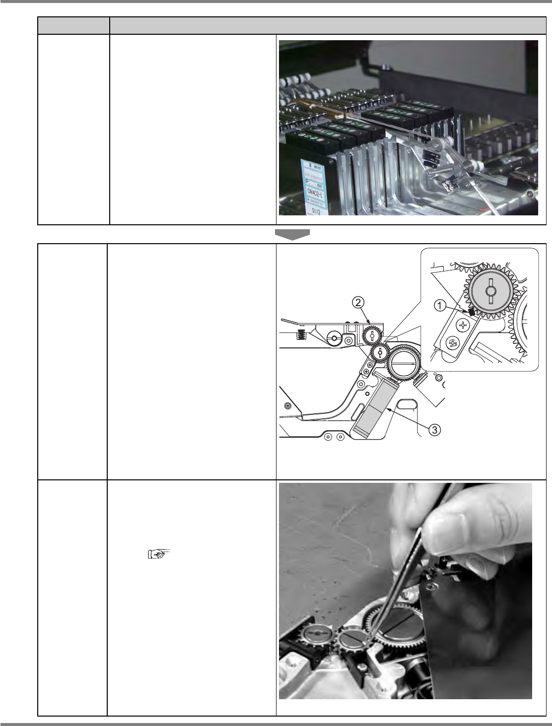 Intelligent Tape Feeder 操作手册 7.1 关于故障 INTF-C-OME07-A01-12 Page 7-5 项目 詳細 故障现象 • 即使按下封盖带的导入开关也不进 行导入动作。 • 导入齿轮未运转。 • 牵引电机出现异常声音。 ( 轰隆隆的 声音 ) 原因 在导入齿轮内由于芯片等异物而被卡 住。 对策 • 除去导入部卡入的芯片等的异物。 • 除去驱动齿轮内部卡入的异物。 步骤因供料器的不同而有所不同。 请参考…