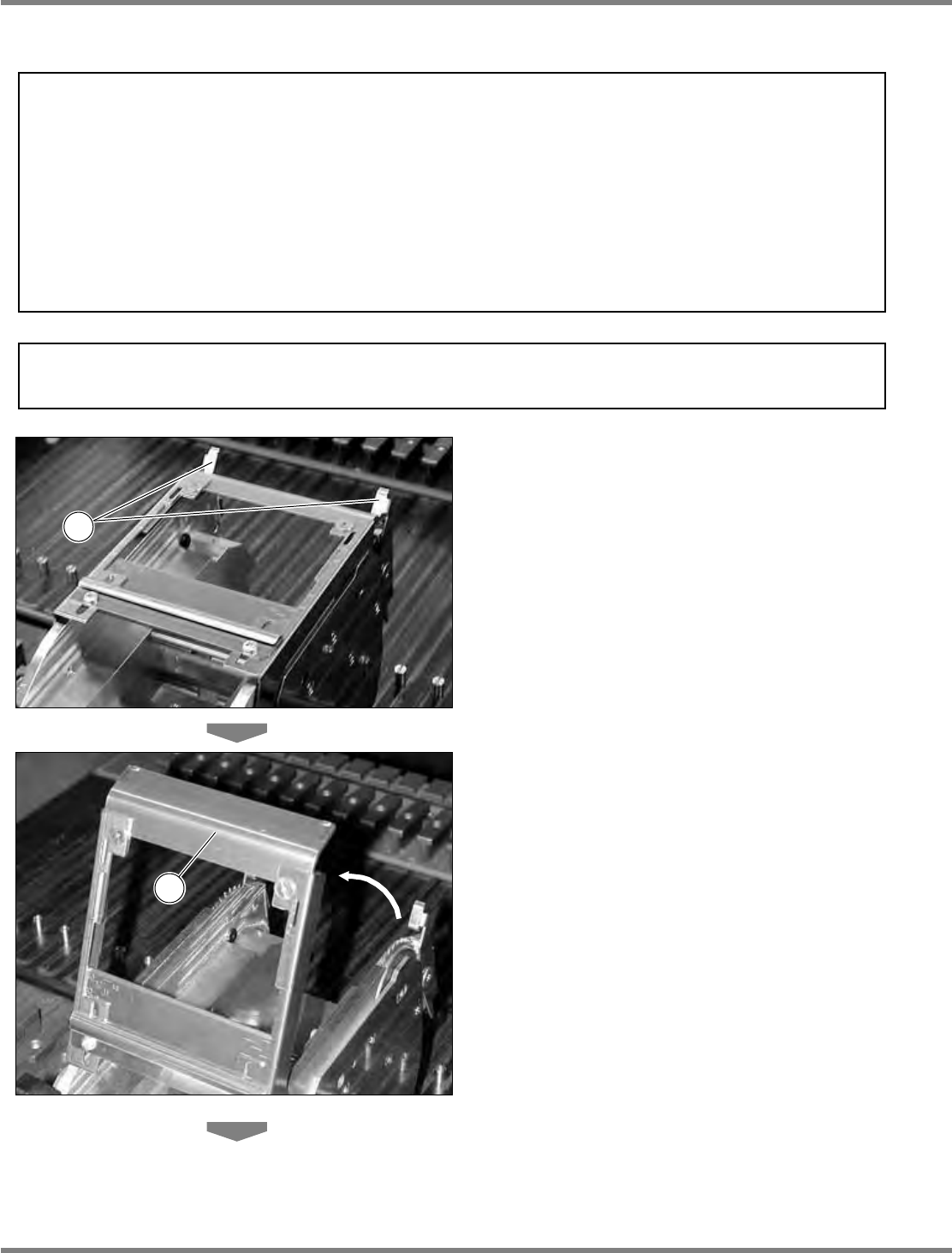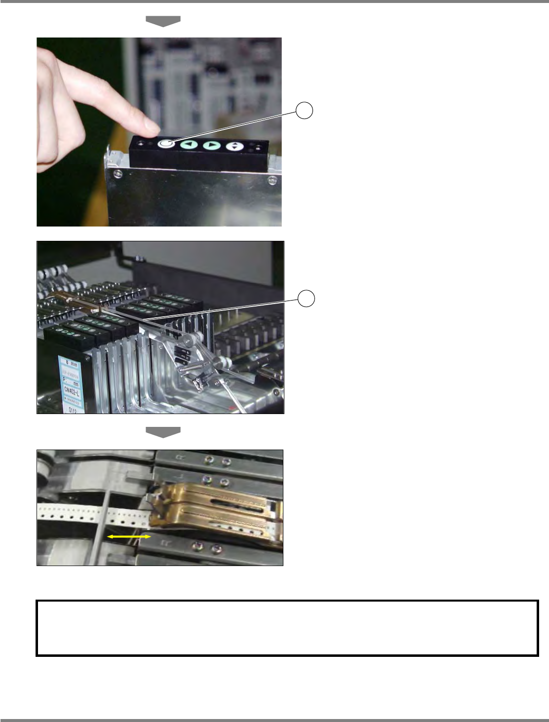 Intelligent Tape Feeder 操作手册 2.2 编带的设置 Page 2-20 INTF-C-OMB02-A01-12 88 mm ~ 104 mm 编带供料器 将在 88 mm 编带供料器部分进行步骤说明。 1. 将插锁 往箭头所示的方向推,然后解除 锁定。 2. 将编带压盖 往箭头所示的方向放开。 通知 88 mm 编带供料器的安装方法与 12 ~ 72 mm 编带供料器有下列 2 个不同点。 在设…