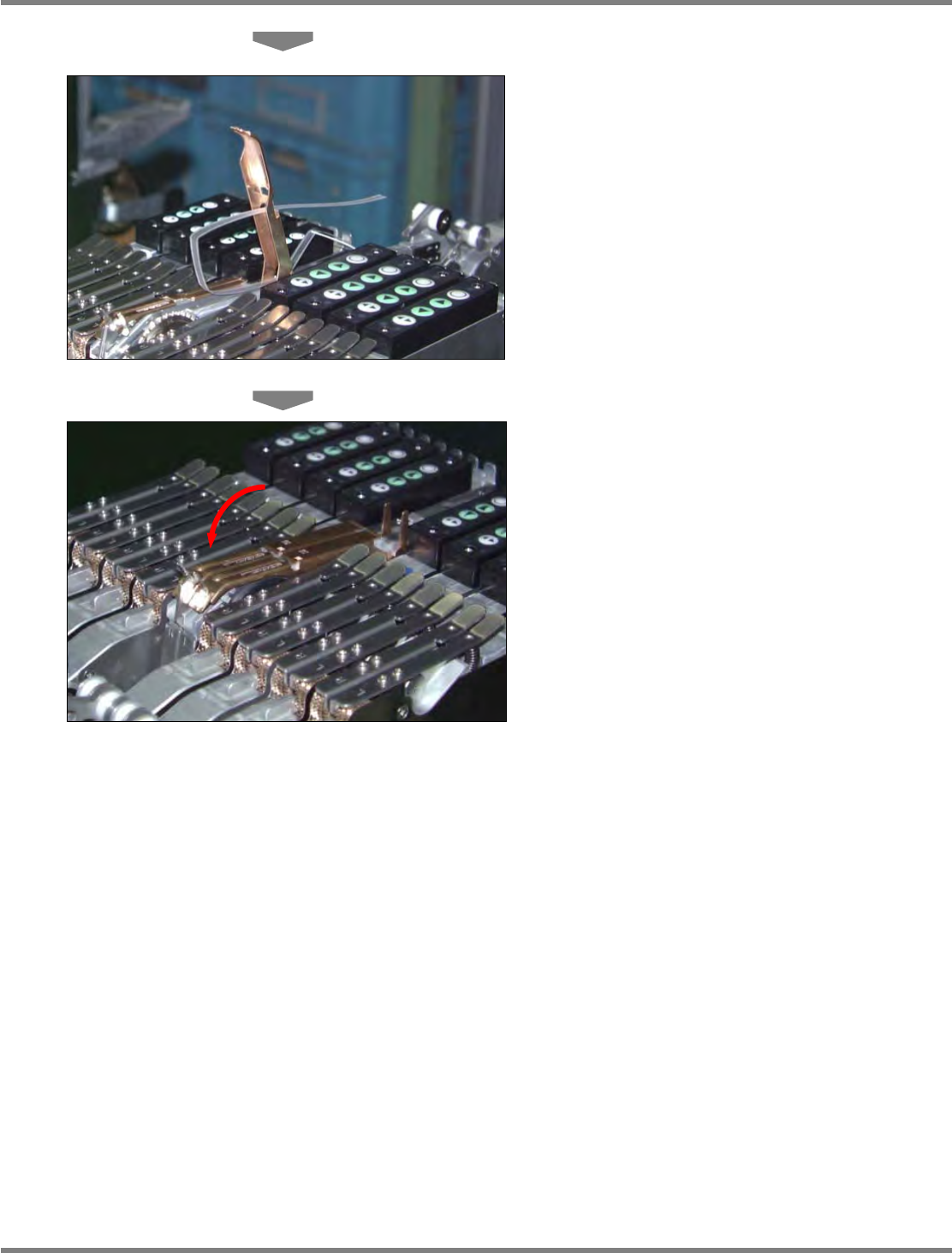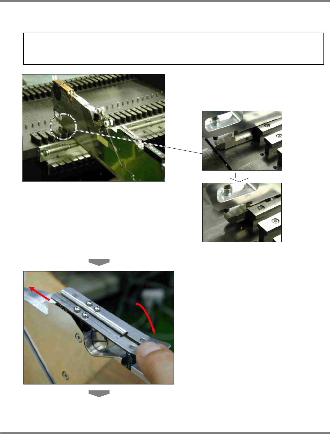 Intelligent Tape Feeder 操作手册 2.2 编带的设置 Page 2-26 INTF-C-OMB02-A01-12 3. 用剪刀把压封盖带 引入后,在导滚齿轮 附近剪断。 4. 卸下插锁 ,打开编带压盖 。 请务必取出袋内残留的芯片。 5. 用手指把载体编带的尖端往箭头所示的方 向推,解开连轮齿和编带的咬合。 INTF-035P INTF-023P 1 2 INTF-033P 1
