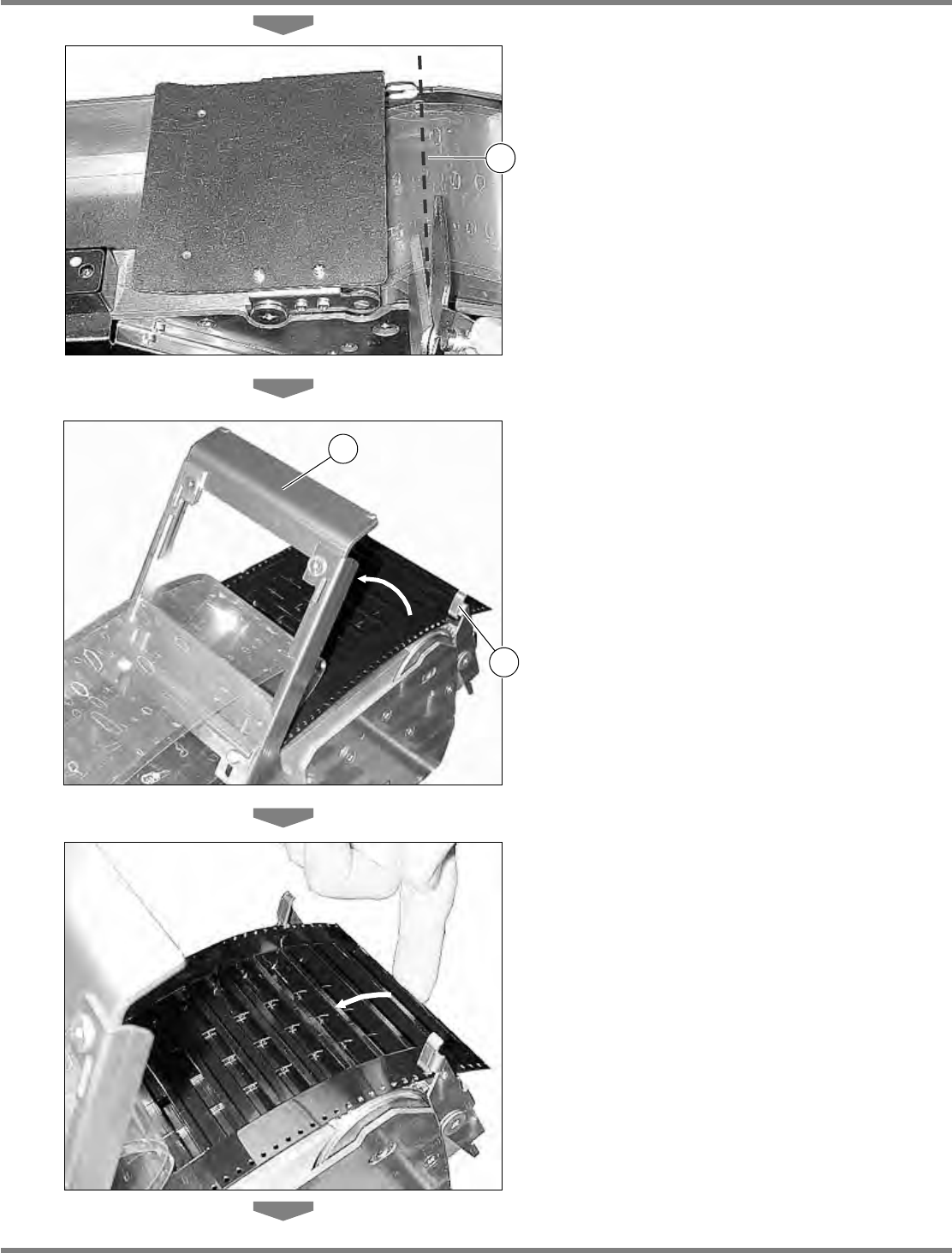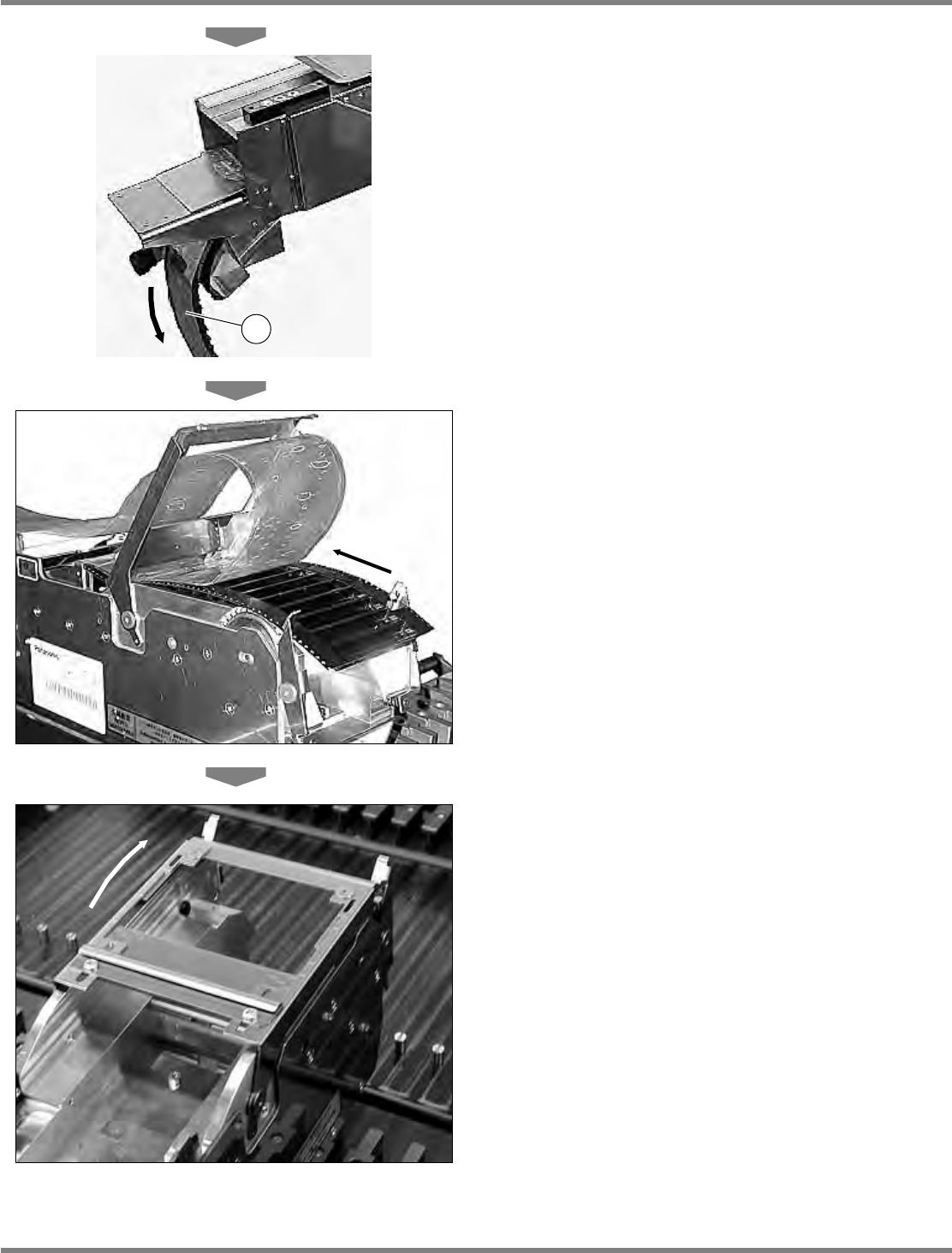 Intelligent Tape Feeder 操作手册 2.2 编带的设置 INTF-C-OMB02-A01-12 Page 2-29 3. 在导滚齿轮附近 剪掉封盖带。 4. 取下插锁 后打开编带压盖 。 请务必除去残留在芯片口袋的芯片。 5. 用手指把载体编带的尖端往箭头所示的方 向推,解开连轮齿和编带的咬合。 INTF-126P INTF-125P 2 3 INTF-124P 1