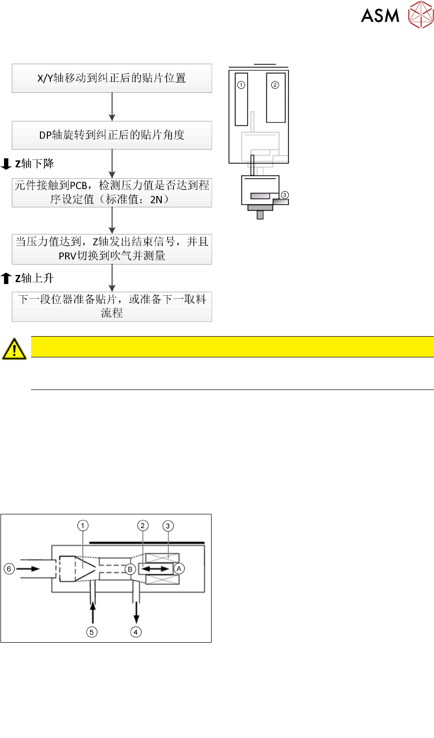 5 贴片头 5.3 双头 技术培训 SIPLACE TX系列 10/2016 143 详细的标准贴片 1. Z 轴电机 2. 切换真空或吹气的调压阀 3. 力度感应器:测量接触力度 注意 如果贴片期间未达到吹气压力,Z 轴向上的位置就会进行真空检查,从而查看元件的贴片是 否已完成。 温度补偿 定期检查温度传感器,校准偏差值以提高贴片精准度。 5.3.4 真空系统概览 5.3.4.1 真空系统 A - 活塞处于“打开”位置 B - 活塞处…