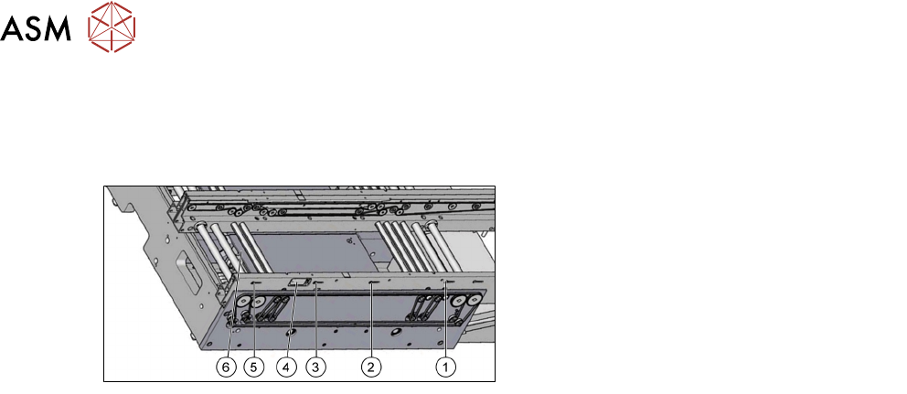 7 传送导轨系统 7.3 传送导轨功能 178 技术培训 SIPLACE TX系列 10/2016 7.3 传送导轨功能 7.3.1 TX 基板监测和夹紧 1. 输入区挡光板传感器 2. PA 区第二个挡光板传感器(选件) 3. PA 区挡光板传感器 4. 激光传感器 5. 输出区挡光板传感器 6. 挡光板传感器放大器 基板识别 ● 印刷板识别由光纤传感器(包括由发射器和接收器组成的控制单元)监控。 ● 每个轨道在输入、PA 和输出部分…