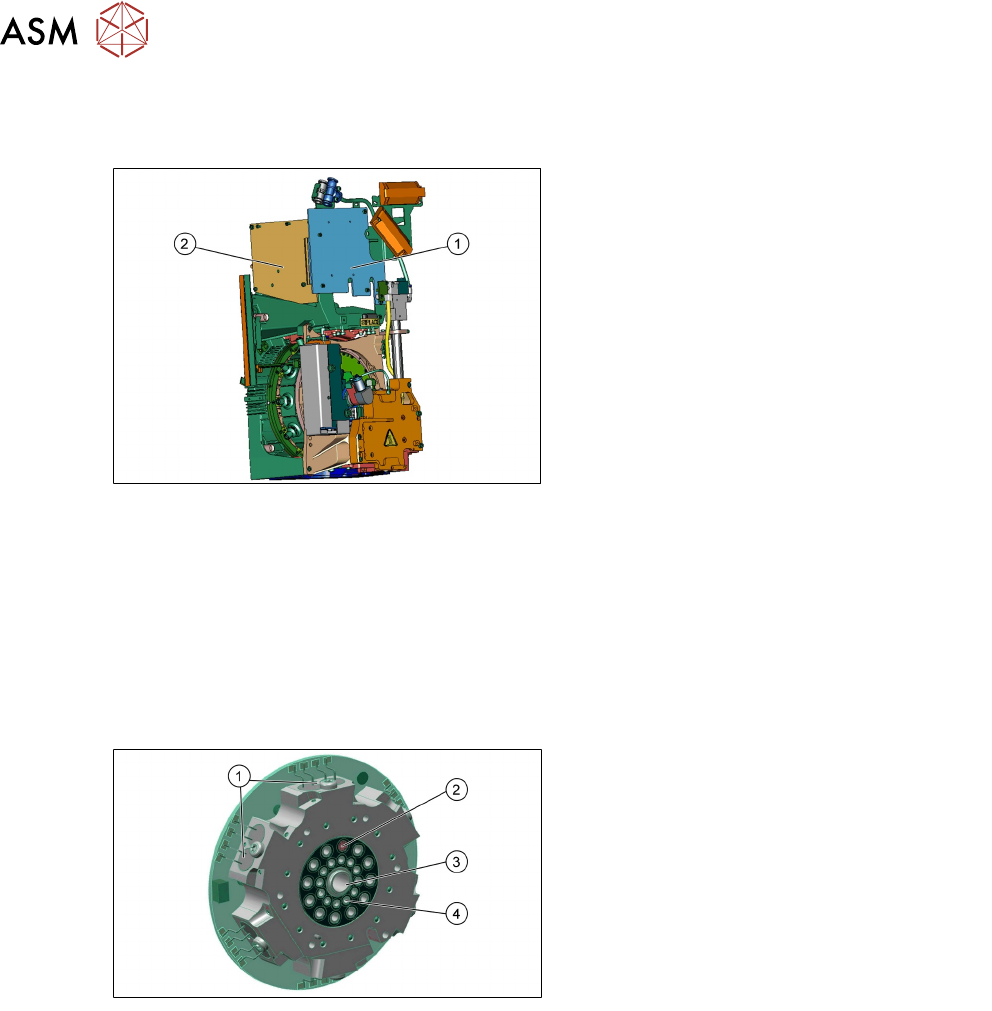 5 贴片头 5.1 CPP 贴片头 技术培训 SIPLACE TX系列 10/2016 59 5.1.2.7 前半头 1. 前半头 2. 返回气缸 3. 带狭口和测量系统滚道的 Z 轴 4. 固定压力控制阀的夹具 5. 调压阀夹具 前半头 ● CPP 贴片头的前半头用四颗螺钉固定在贴片头框架上,维修时需作为整件拆卸。 ● 除 PRV 外,请勿拆除前半头的其他部件,因为所有部件均经过专门校准,无法在现场调整。 5.1.2.8 元件传感器 …