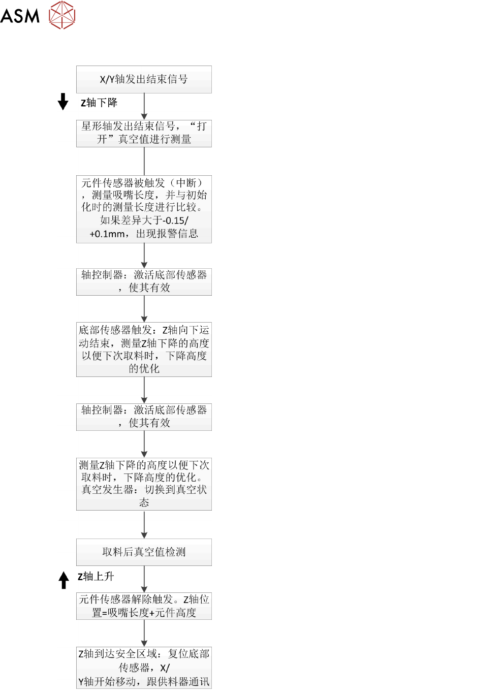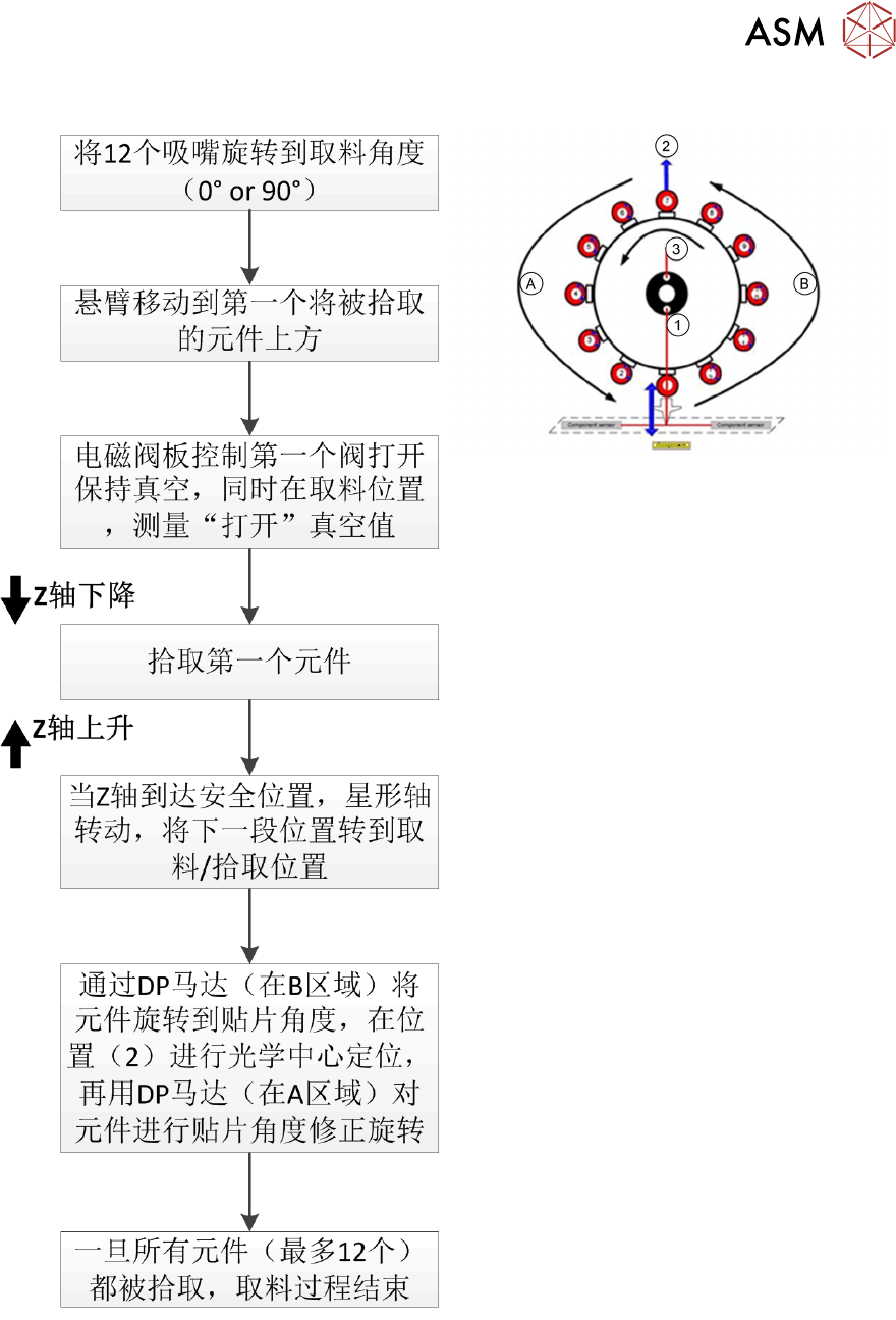 5 贴片头 5.1 CPP 贴片头 64 技术培训 SIPLACE TX系列 10/2016 详细的拾取流程 拾取过程开始前,每个段位器的保持回路会被阀门板打开。 因为每个轴的行程路径可以计算,所以下步操作(例如,启动 Z 轴)可通过位置标志启动。 例如,Z 轴在星形轴发出终了信号 10 m 之前开始下移。