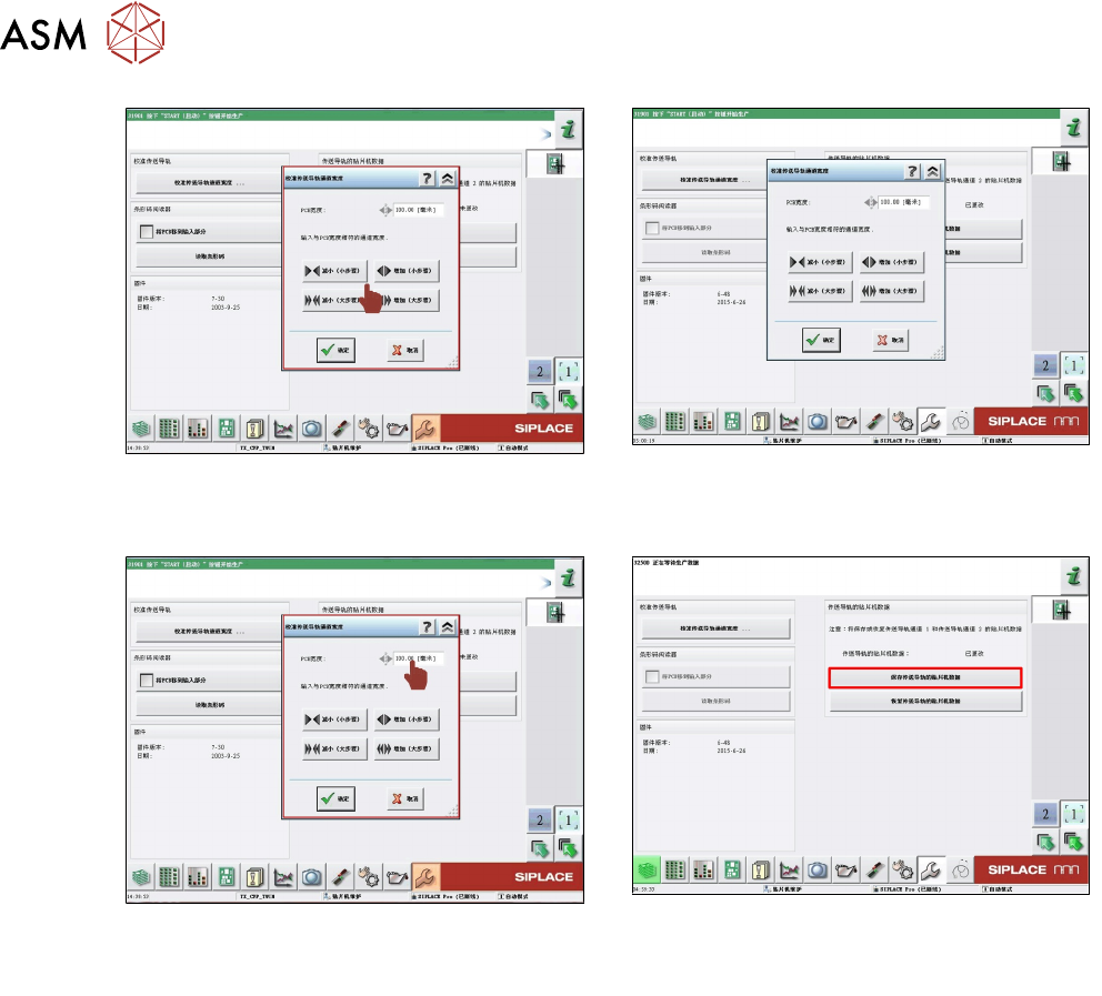 7 传送导轨系统 7.5 部件更换/设置/校准 188 技术培训 SIPLACE TX系列 10/2016 5. 单击 Decrease 或 Increase 以使传送导轨宽 度匹配当前值。 5a. 输入实际测量所得的传送导轨宽度。 单击 OK 。 5b. 或者,输入基板宽度 值 (键入当前 PCB 宽 度)。 6. 单击 Save machine data for conveyor 。