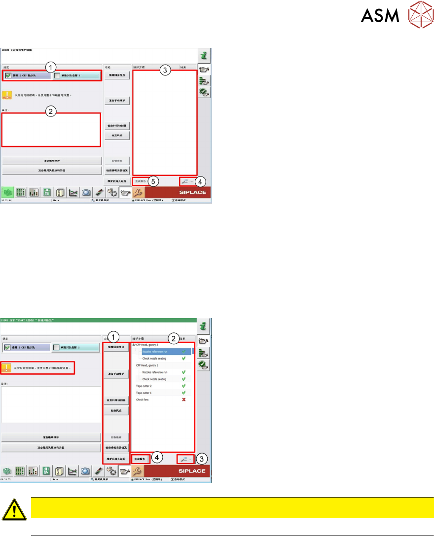 10 贴片机软件概览 10.7 维护界面 248 技术培训 SIPLACE TX系列 10/2016 10.7 维护界面 10.7.1 维护界面概览 维护界面有 3 个维护功能:预防性维护作业、预见性维护和验证。这种构造可使维护、故障排除和 验证工作更加快速便捷。 1. 访问维护界面 1. 预防性维护作业 2. 预见性维护 3. 验证 用户级别: 1. “操作员” 2. “贴片机服务" 3. “高级生产” 10.7.2 预防性…