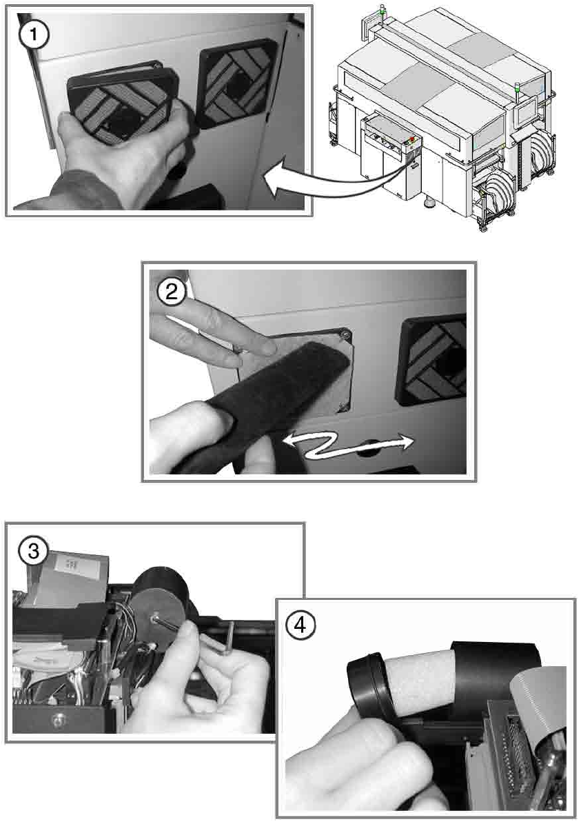 O 利用吸塵器清除料帶容器中所有掉落的元件,以及不再需要的黏性標籤和膠帶。
