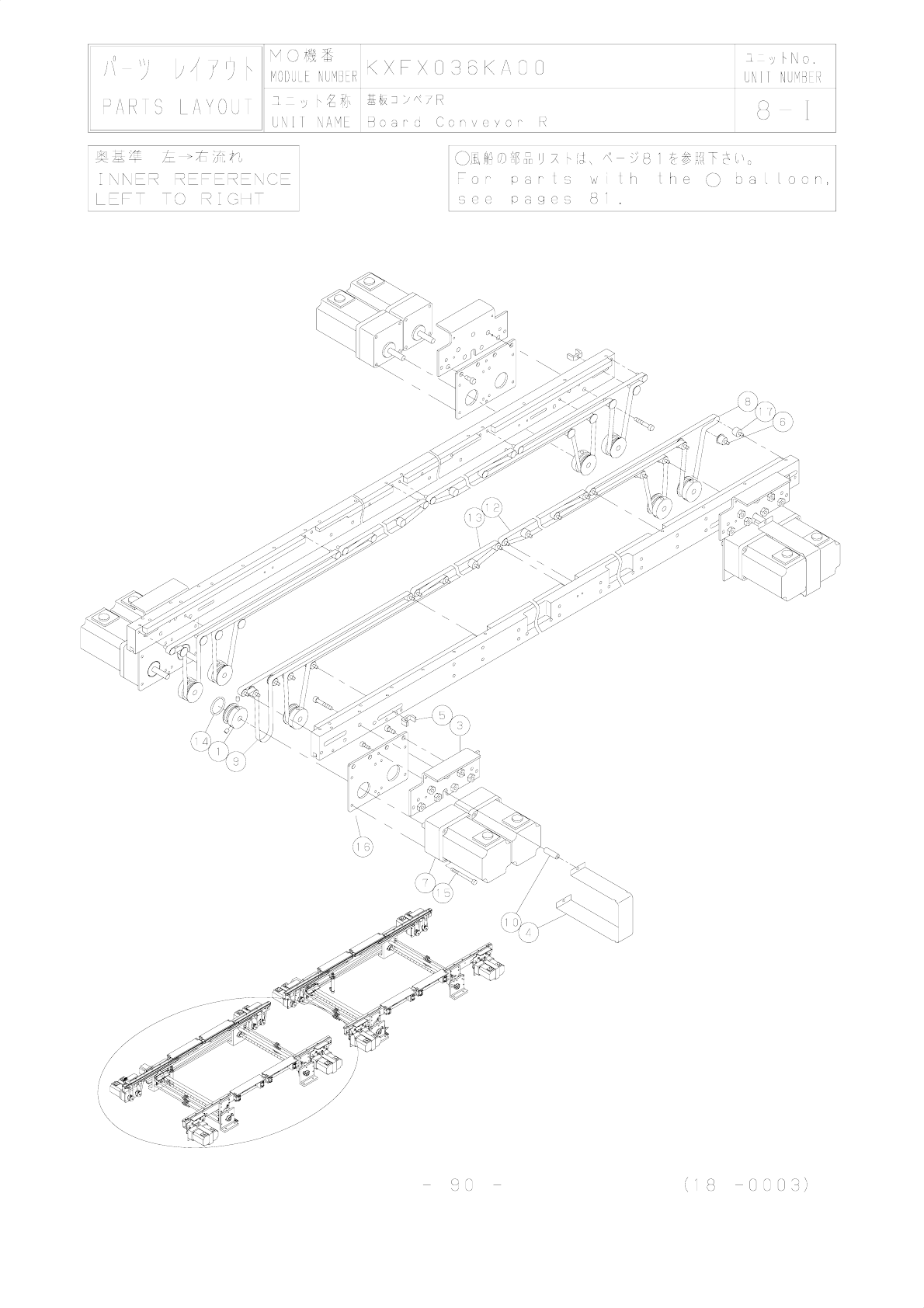 1 2 3 4 5 6 7 8 9 10 11 12 13 14 15 16 17 18 19 20 21 22 23 24 25 26 27 28 29 30 NO 番号 MO機番 ユニット名称 基板コンベアR UNIT NAME PART NUMBER 品番 部品名 型式 数量 ランク 備考 Board Conveyor R PART LIST MODULE NUMBER パーツリスト KXFX036KA00 8-I UNIT NU…