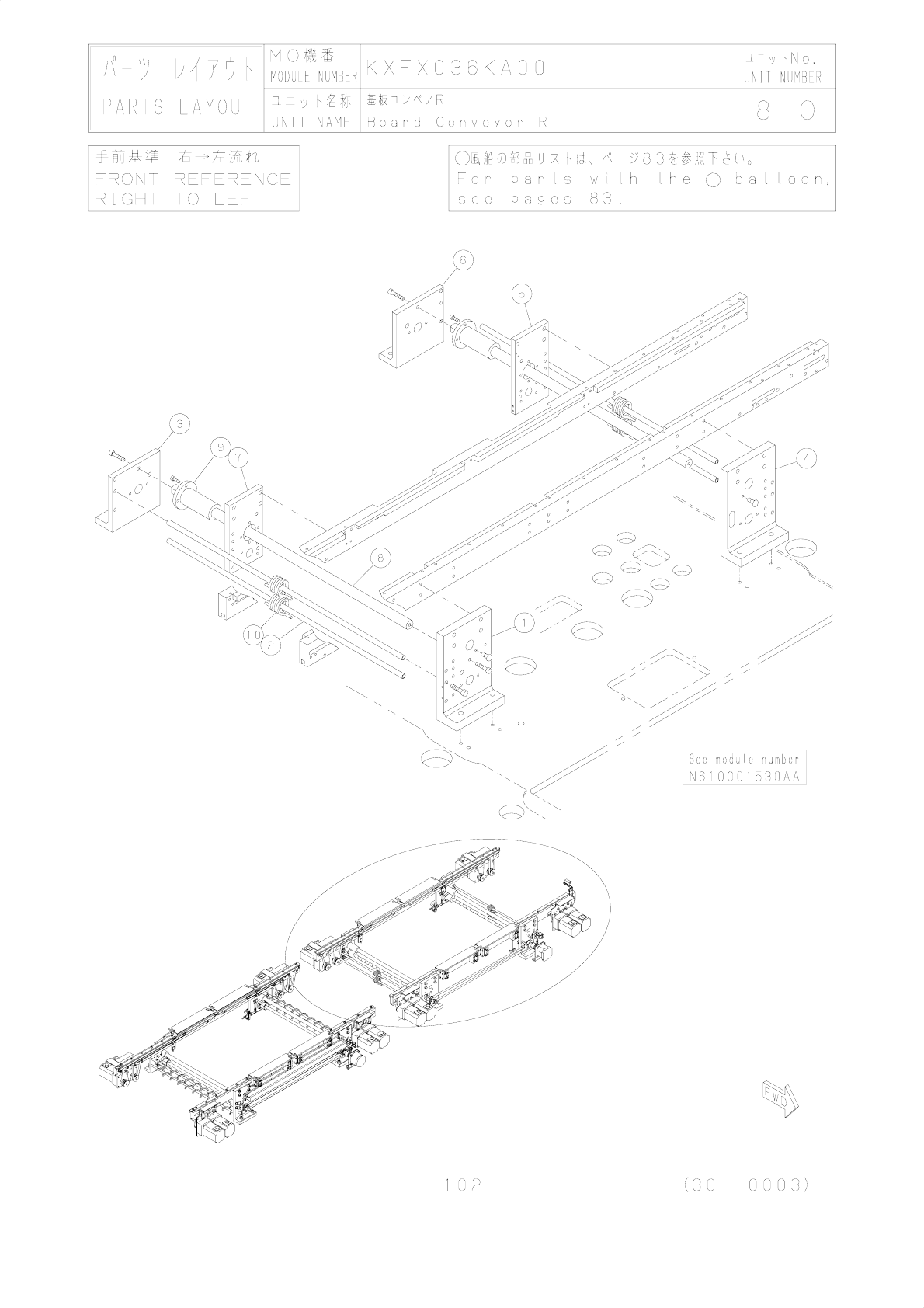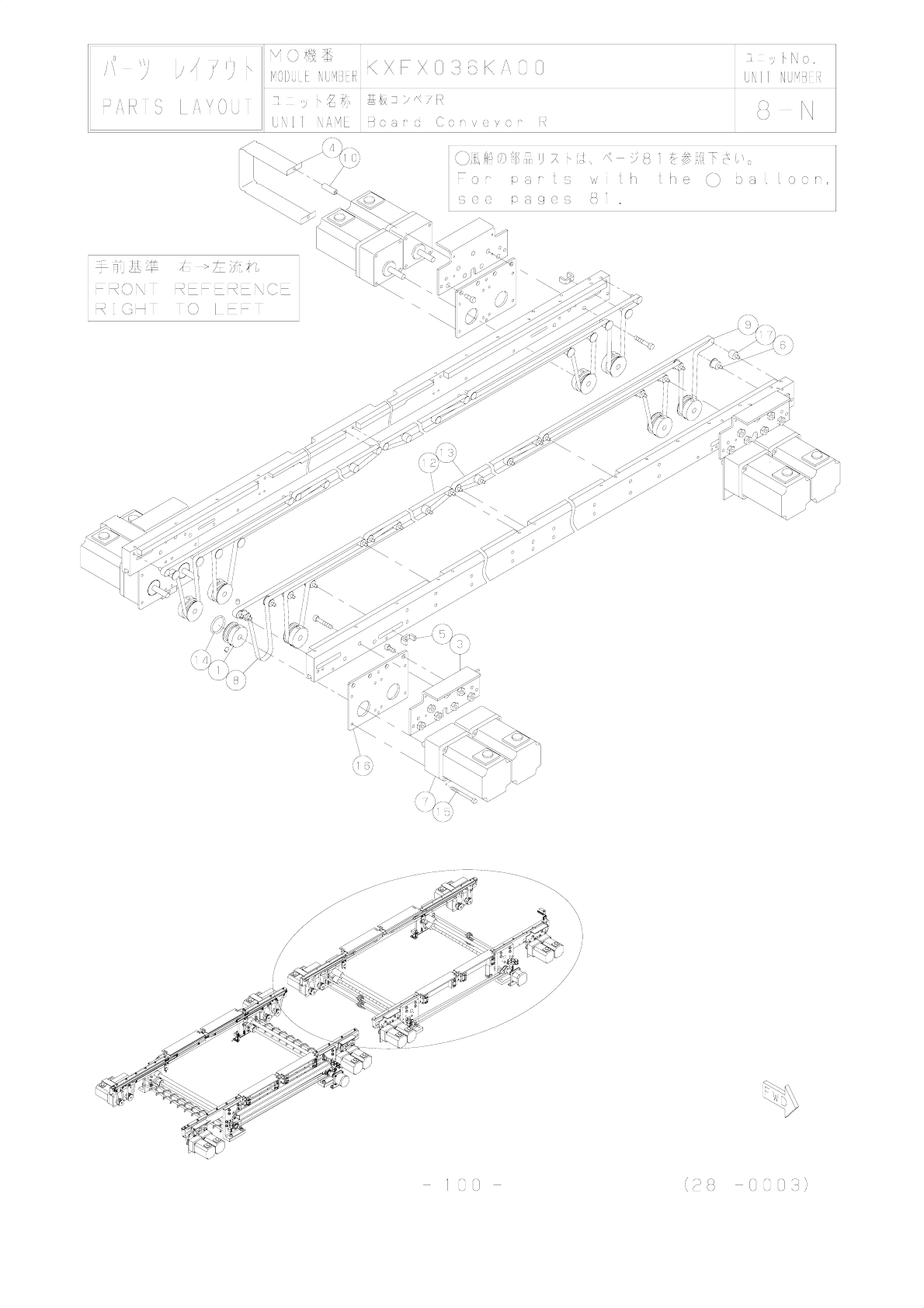 1 2 3 4 5 6 7 8 9 10 11 12 13 14 15 16 17 18 19 20 21 22 23 24 25 26 27 28 29 30 NO 番号 MO機番 ユニット名称 基板コンベアR UNIT NAME PART NUMBER 品番 部品名 型式 数量 ランク 備考 Board Conveyor R PART LIST MODULE NUMBER パーツリスト KXFX036KA00 8-N UNIT NU…