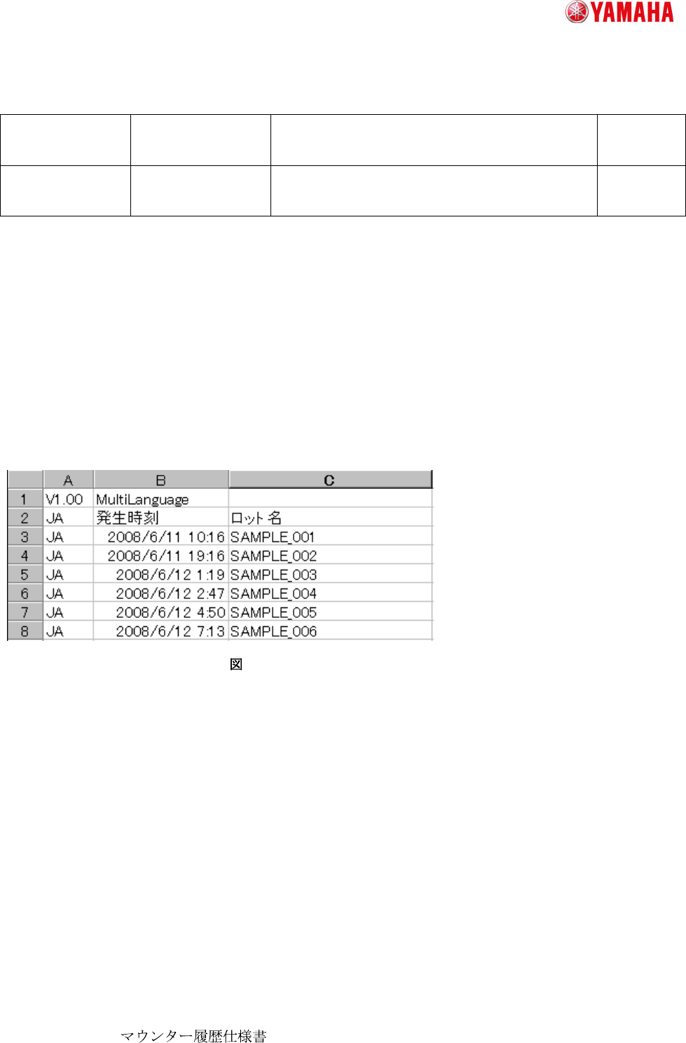 ヤマハ発動 機株式 会社 IM 事業部 マウンター技術 部 ソフト開発グループ MDOC-SOFT 50011 H015931 _TT6094. .doc 1 1 / 58 詳細 X エラー や作 業に詳 細データ がある場 合にそ の内 容。 ※1 作業者 山葉太郎 エラー や作業 のイ ベント発生時 にログ インして いた作業担 当者名 ※1 ※1 初期バージョン(X G は V1.00、 YG は V2.0…