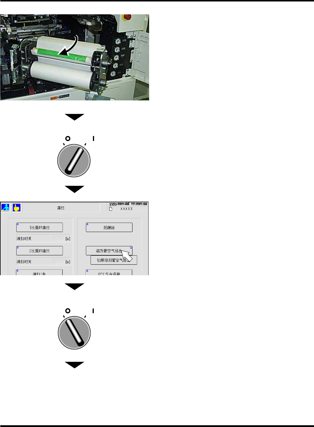 SP 80/SP 60 维修手册 1.4 140 小时检查 ( 一周一次 ) Page 1-39 10. 确认溶剂均匀地吹向清洁纸。 ∗ 当不出溶剂或者吹气不均匀时,请使用针或者 刷子清扫溶剂涂敷喷嘴。 名称 溶剂涂敷喷嘴 溶剂 清洁纸 11. 将清扫装置返回到主体内。 12. 关闭前面和中央的安全盖。 13. 将伺服开关置于 ON 。 14. 按功能键 。 • 将返回 < 机器调整菜单 > 画面。 OFF ( …
