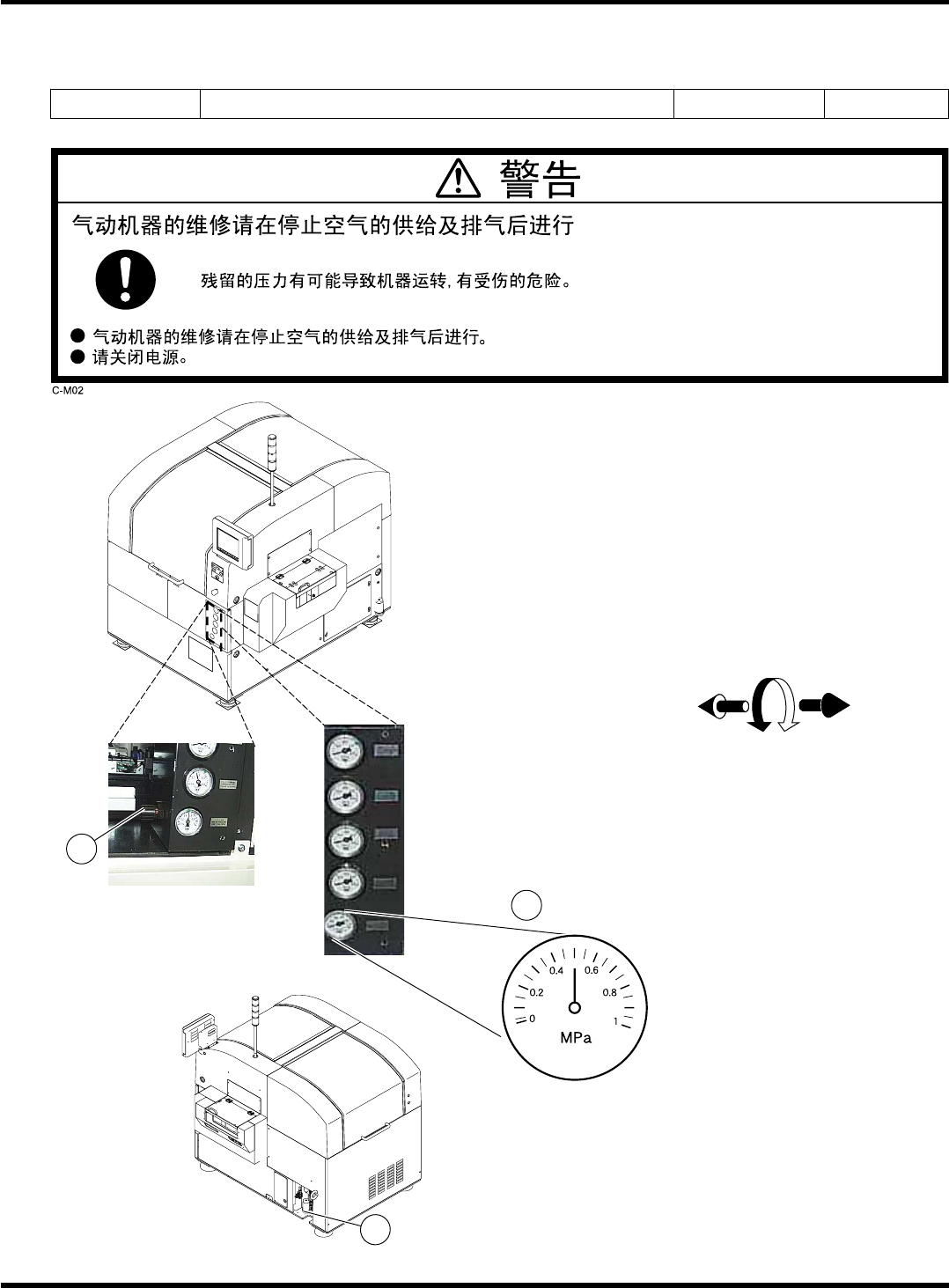 SP 80/SP 60 维修手册 1.5 560 小时检查 (1 个月一次 ) Page 1-50 1.5. 3 刮板上升气压的确认 刮板上升气压的确认 刮板上升气压的确认 刮板上升气压的确认 使用工具 需要时间 1 分钟 1. 确认供给气压 。 ∗ 气压为 0. 2 MPa ∗ 如果不是 0. 2 MPa ,请拧松螺母用螺丝进行调 整。 ∗ 调整完后,请务必进行印压示教。 名称 压力计 螺母 螺丝 1D3C-439E …