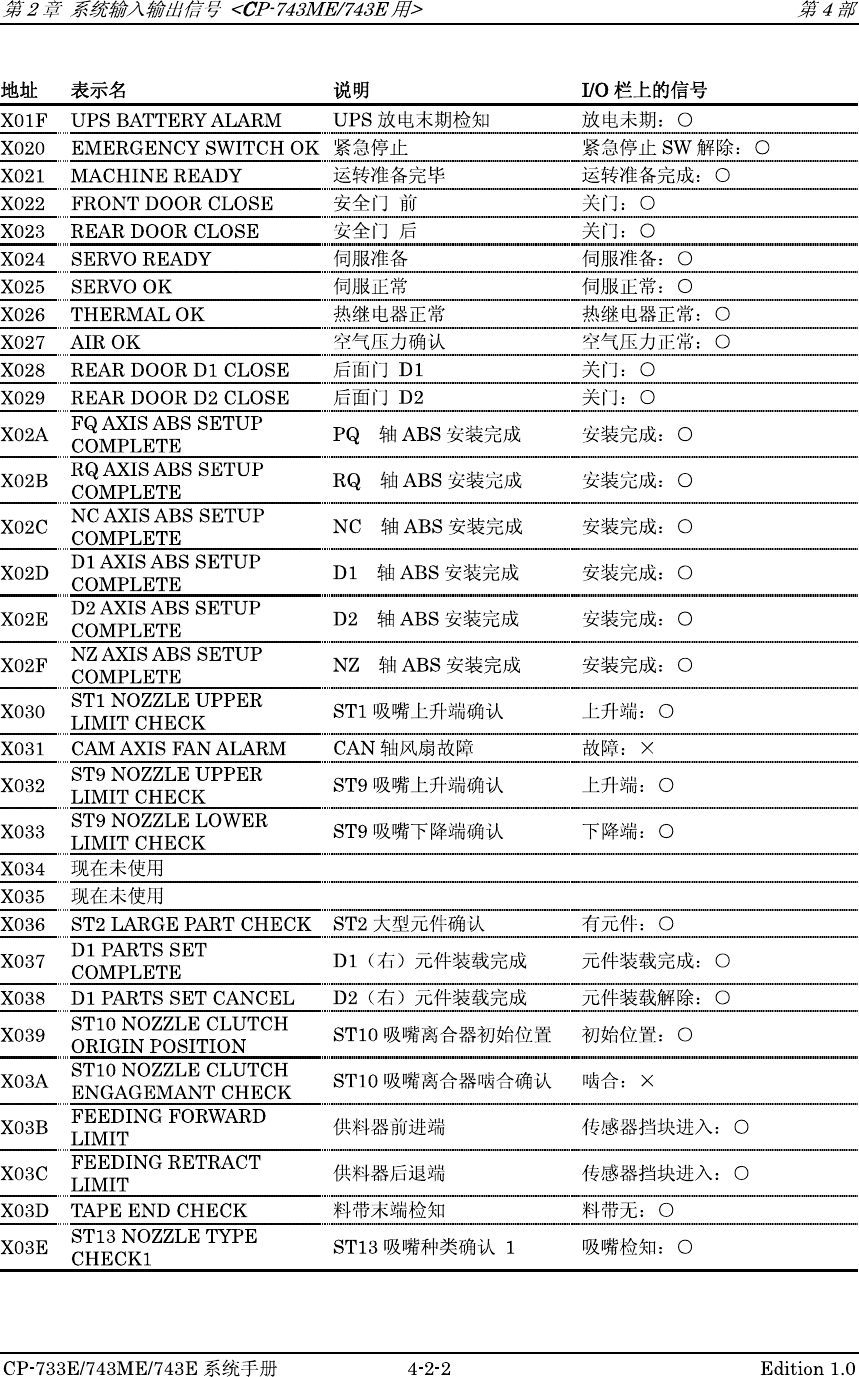 第 4 部 第 2 章系统输入输出倍号 < CP 743 ME / 743 E 用 > 2 . 系统输入输出信号 < CP _ 743 ME / 743 E 用 > 在 [ I / O 信号状态 ] 栏上 、 表小出了机器的状态和输入信号的关系 。 o : 绿色表示 ( . # 信号 ) X : 白色表示 ( 无信号 ) 2.1 系统输入信号 ( 以 INPORT 表示 ) Input - 1 地址 表示名 I …