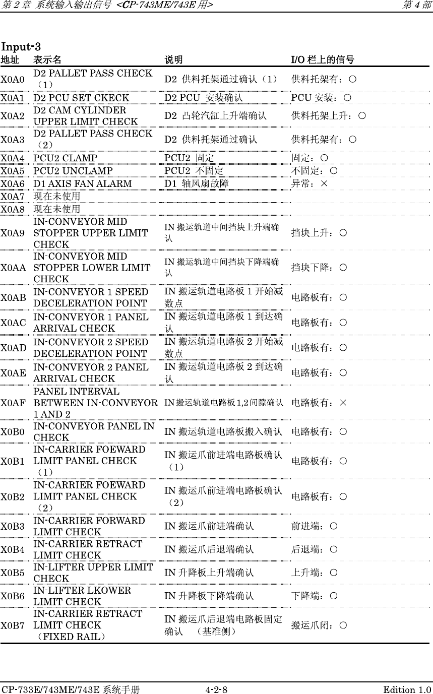 第 4 部 第 2 章系统输入输出信号 〈 CP - 743 ME / 743 E 用 〉 I / O 栏上的信号 地 址 表 示 名 说 明 D 3 PALLET SETTING CHCK ( 1 ) D 2 供料托架安装确认 ( 1 ) 供料托架有 : O X 09 D D 3 PALLET SETTING CHCK ( 2 ) D 2 供料托架安装确认 ( 2 ) 供料托架有 : O X 09 E D 2 PALLET CONFI…