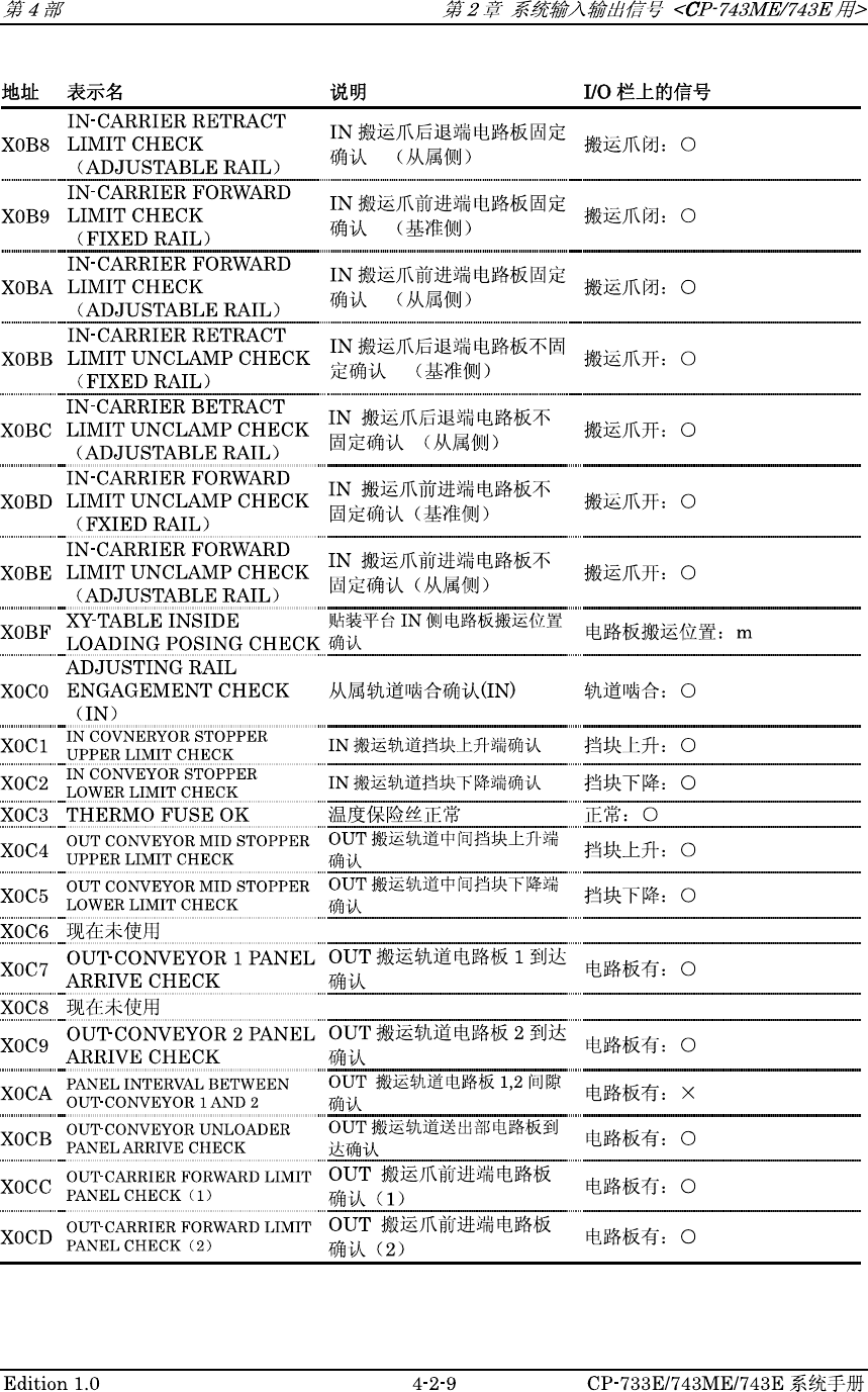 第 4 部 第 2 章系统输入输出信号 〈 CP - 743 ME / 743 E 用 〉 I / O 栏上的信号 地 址 表 示 名 说 明 IN - CARRIER RETRACT X 0 B 8 LIMIT CHECK ( ADJUSTABLE RAIL ) IN 搬运爪后退端电路板固定 确 认 ( 从 属 侧 ) 搬运爪闭 : O IN - CARRIER FORWARD X 0 B 9 LIMIT CHECK ( FIXED …