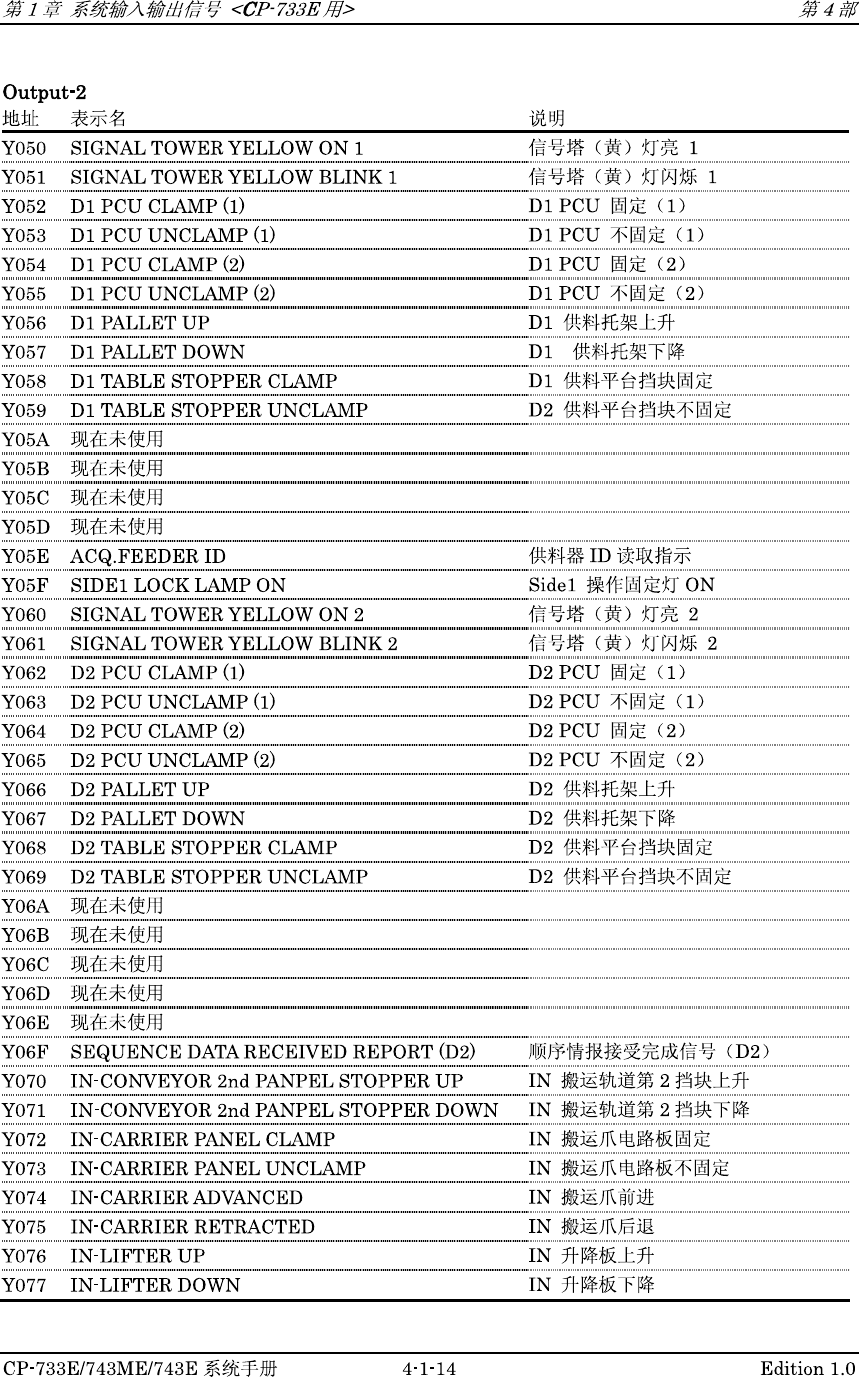 第 4 部 第 1 V 系统输入输出信号 < CP - 733 E 用 > 说明 地址 表示名 IN 搬运轨道电机逆转 ON Y 02 A IN - CONVEYOR MOTOR REVERSE ON Y 02 B IN - CONVEYOR MOTOR REDUCE ON Y 02 C 现 Y 02 D OUT - CONVEYOR MOTOR ON Y 02 E CONVEYOR WIDTH MOTOR ON IN 搬运…