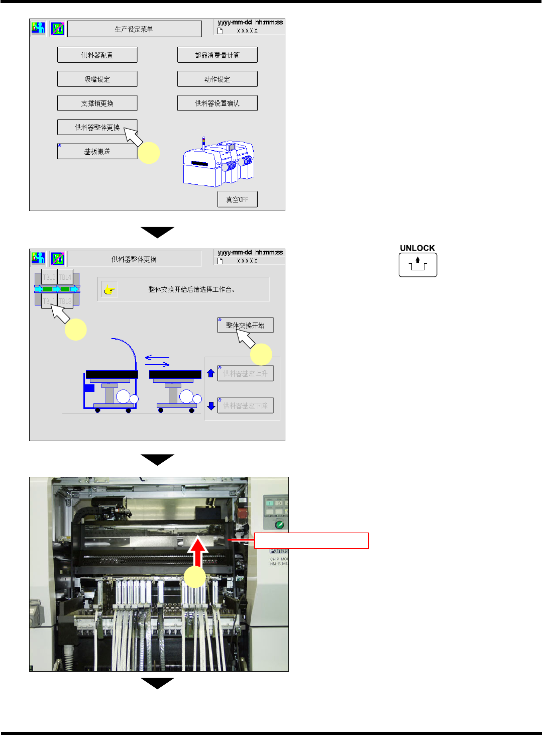 CM602-L 操作手册 3.3 整体交换台车的供 料器整体交换 Page 3-8 3.3 整体交换台车的供料 器整体交换 事先对整体交换台车进 行离线准备 ∗ 1 , 然后切换机 种时交换整体交换台车。 采取此方式, 则可同时 交换多量供料器。 ∗ 1: 若要不使用本机对整 体交换台车进行离线准备 ,需要整体交换台车准备装 置 ( 选购件 ) 。 要求 • 该维护作业,应在电源开关以及伺服开关处于 ON ( I ) 的状态下进行。在吸…