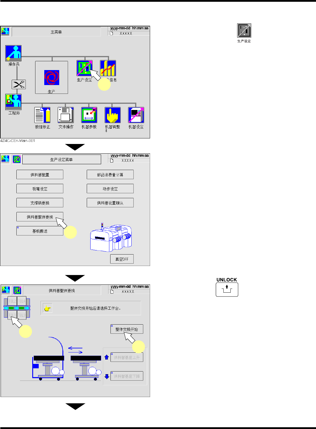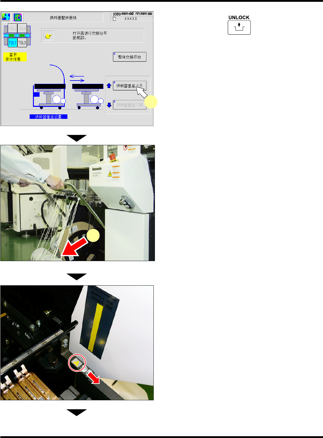 CM602-L 操作手册 3.3 整体交换台车的供 料器整体交换 Pa ge 3- 11 9. 先将供料器工作台的盖关闭、再关闭安全 盖。 10. 解除锁定,拔出连接器。 3.3.2 离线准备 使用整体交换台车准备 装置 ( 选购件 ) 设置整体交换台车的供料 器。 1. 将整体交换台车的电缆连接到整体交换台车准备装置 ( 选购件 ) 。 2. 安装所需要的供料器和元件。 关于安装供料器的方法 ,请参照 “3.1 智能供料器的设 置…