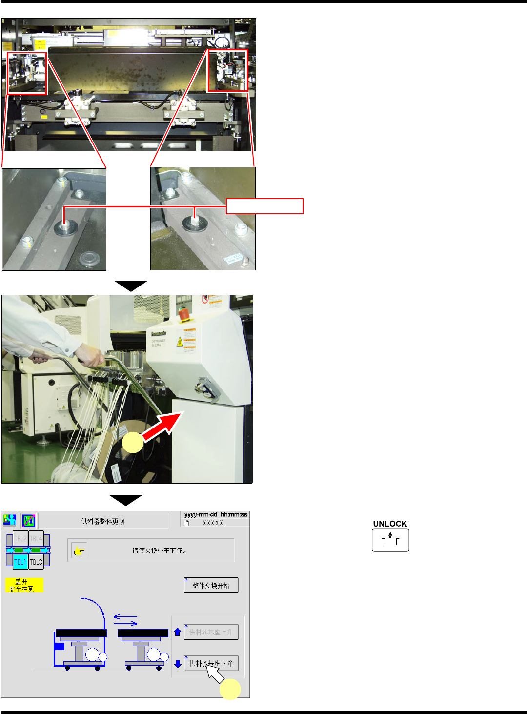 CM602-L 操作手册 3.3 整体交换台车的供 料器整体交换 Pa ge 3- 13 5. 打开安全盖。 6. 打开供料器工作台盖。 7. 接上连接器并锁住。 8. 按操作面板上的 + [ 供料器基座 上升 ] 。 下一页 EJM4A -058P 6 EJM4A -056P 7 EJM8A- C-OMC03-A01- 00 EJM8A -Pc-0027 8