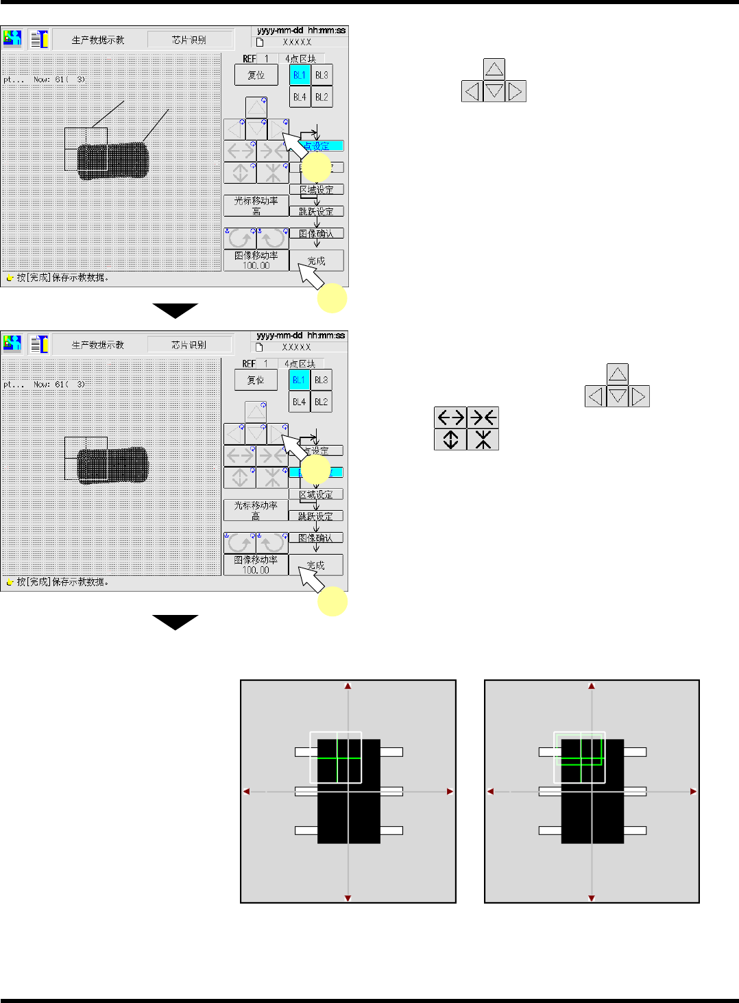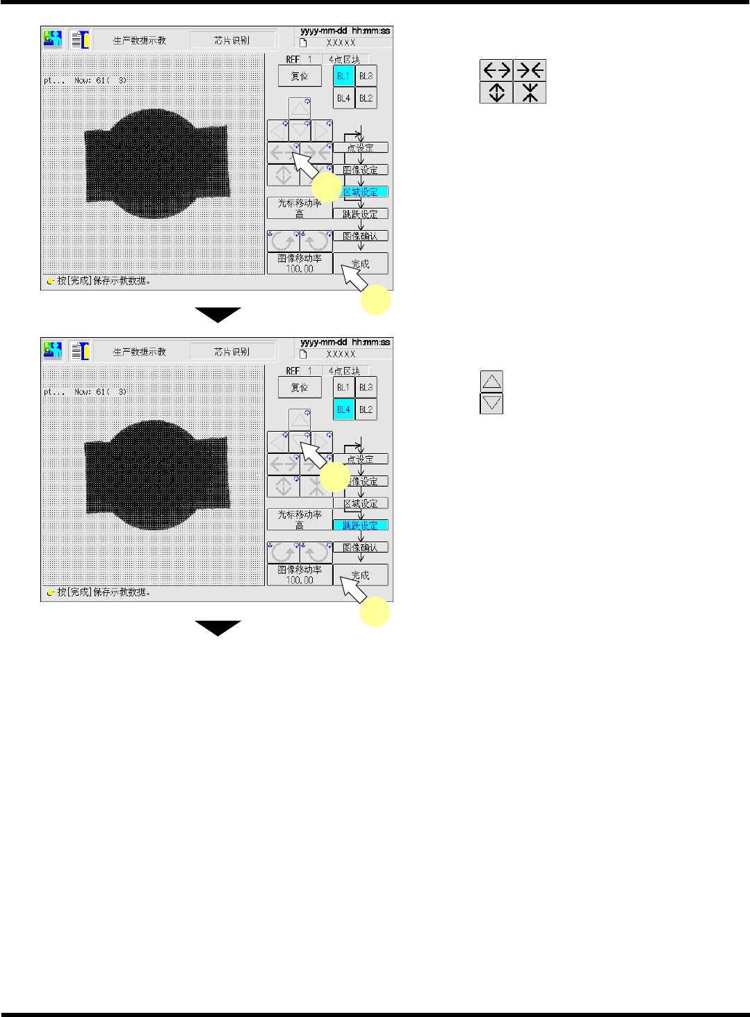 CM602-L 操作手册 4.4 芯片识别示教 Pa ge 4- 25 16. 设定 BL1 的识别区域。 • 用 设定大小。 请将识别点 ( 在步骤 11. 中 ) 设入区域内。 17. 按 [ 完成 ] 。 • 自动保存数据。 18. 步骤 12. ~ 17. 将重复操作, 请设定到 BL4 。 19. 设定跳过值。 • 按 设定该值。 用搜索识别图像时的值 仔细搜索 :1<1 0: 粗搜索。 ( 通常为 : 4) 识别图像的…