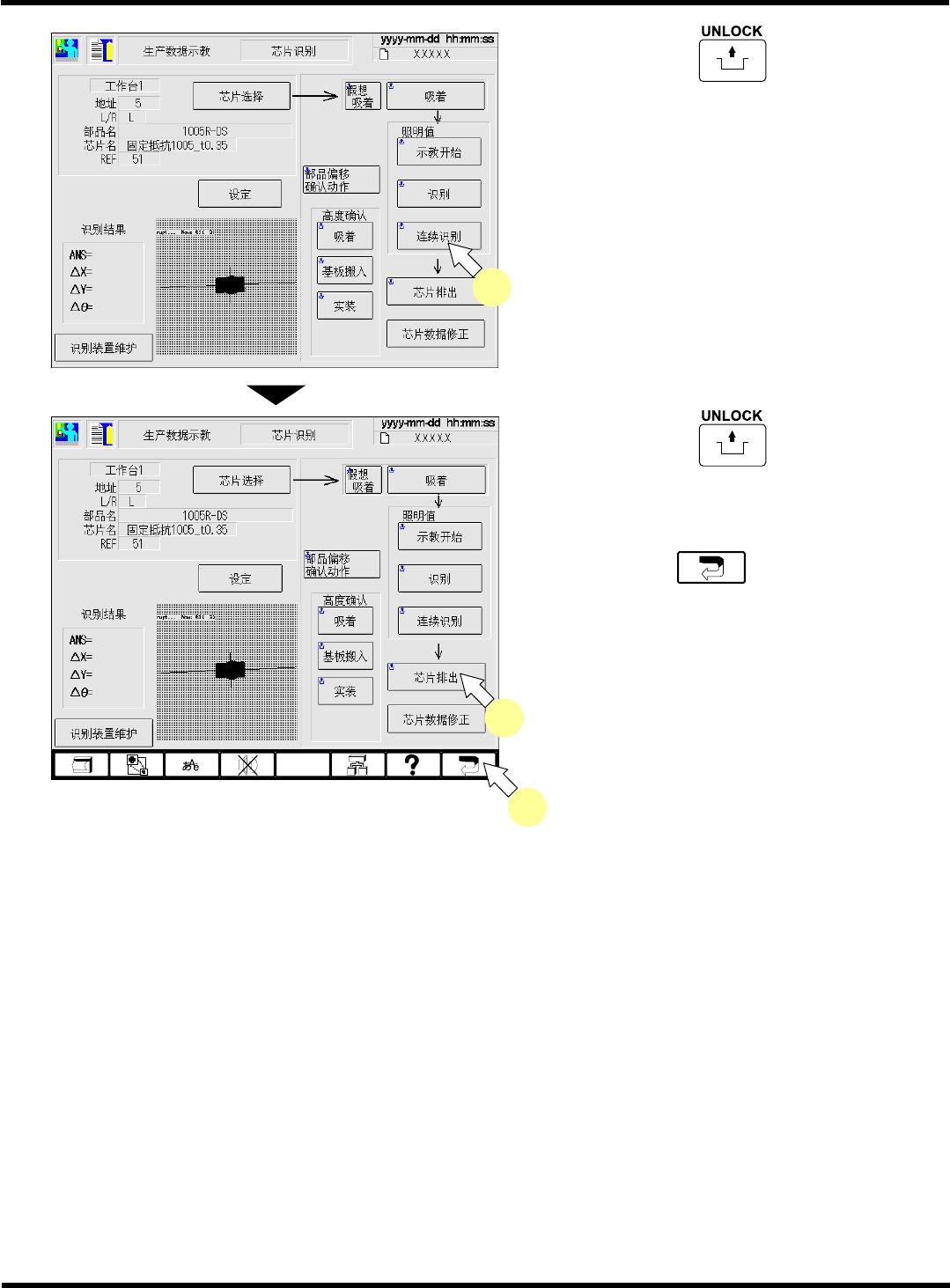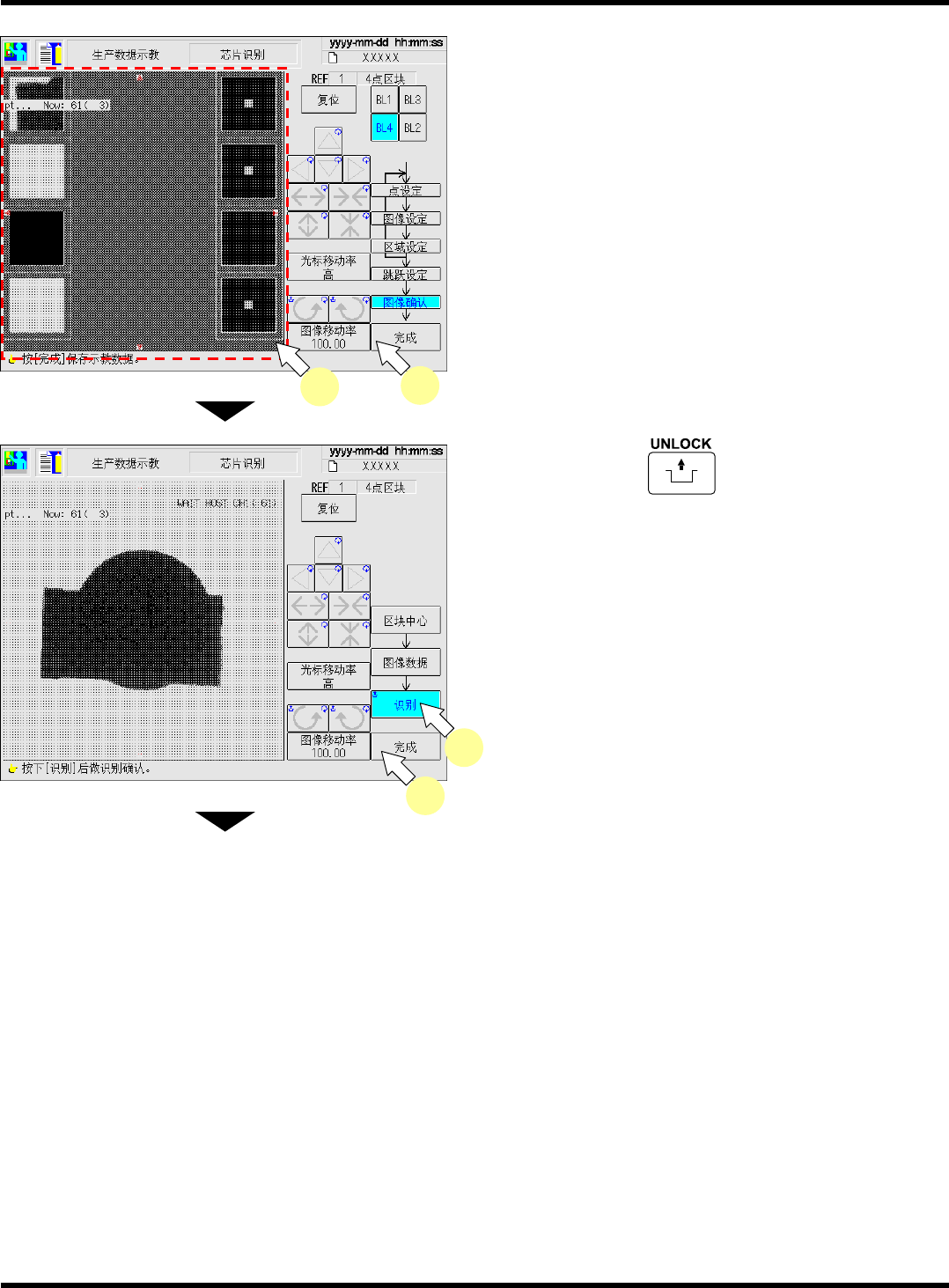 CM602-L 操作手册 4.4 芯片识别示教 Pa ge 4- 27 25. 按操作面板的 + [ 连续识别 ] 。 ( 确 认 ) • 连续识别 10 次,显示识别 结果。确认结果后, 按 [ESC] 关闭显示结果。 ( 本操作仅为确认,不一定 必须执行。 ) ∗ 当识别结果 (ANS=) 在识别率 ( 机器参数的不 良判定率 ) 以下时, 请通过进行步骤 6. ~ 23. 的 操作,改变识别点等方 法重新进行。 26. 按操作面板…