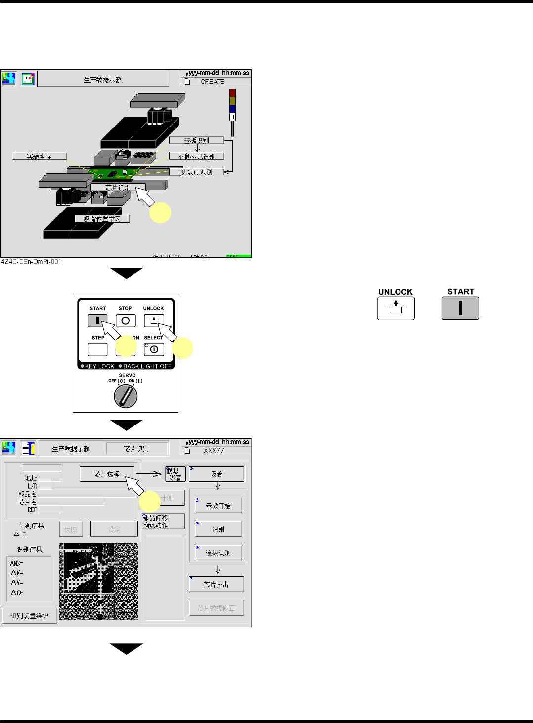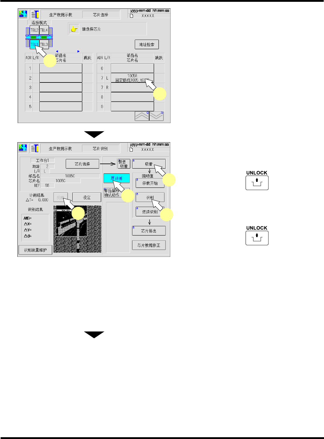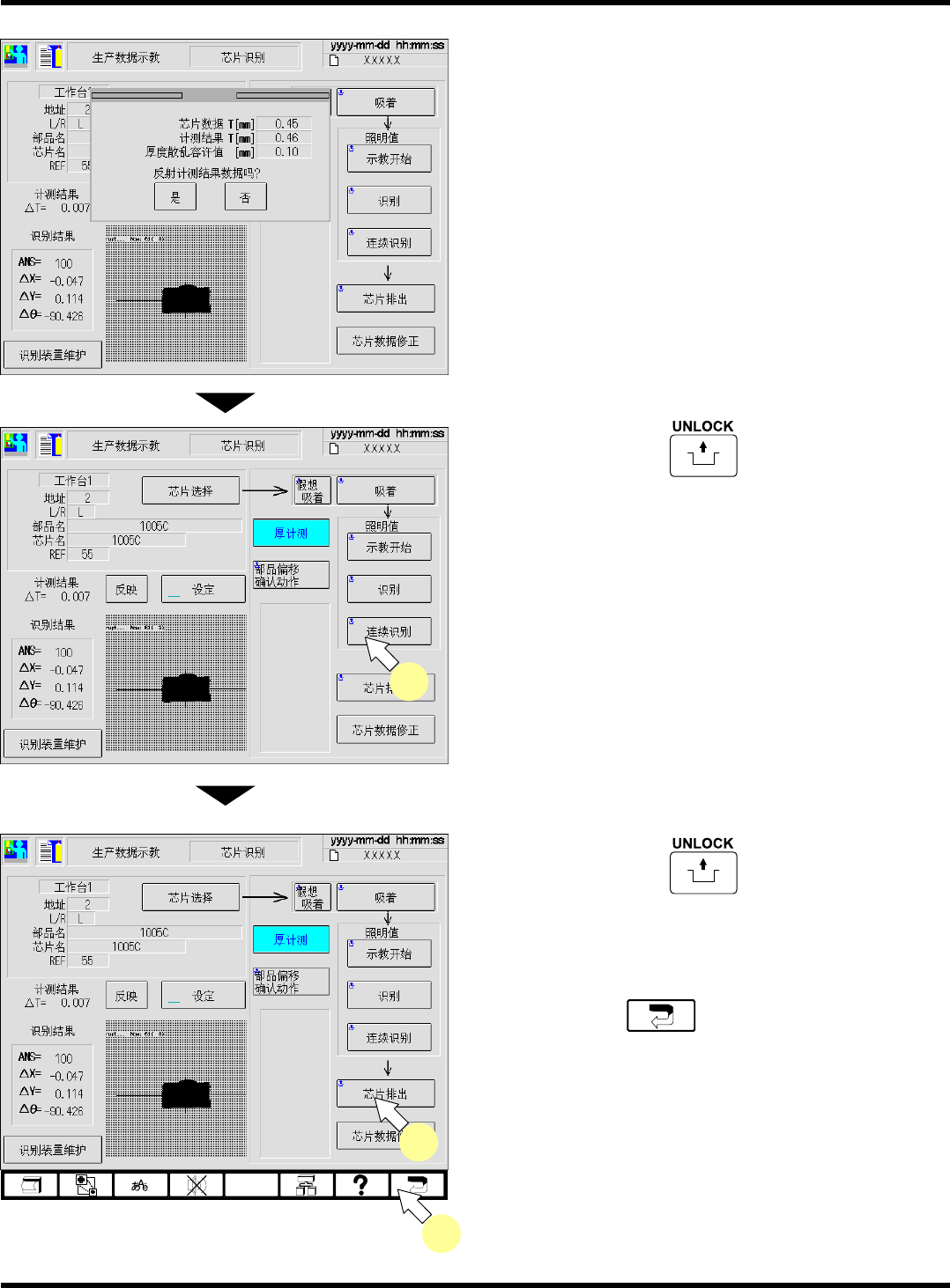 CM602-L 操作手册 4.4 芯片识别示教 Pa ge 4- 29 4. 选择工作台。 5. 按下要识别的芯片。 6. 按 [ 厚计测 ] 。 7. 按操作面板上的 + [ 吸着 ] 。 • 将会进行芯片吸着,并 移动至芯片识别位置。 8. 按操作面板上的 + [ 识别 ] 。 • 开始识别动作。识别完 成后显示计测结果。 • ‘ ∆ T =’ 的计测结果超出芯片 数据的厚度偏差容 许值时,将显示警告信 息,并以黄色反转显示 计测结…
